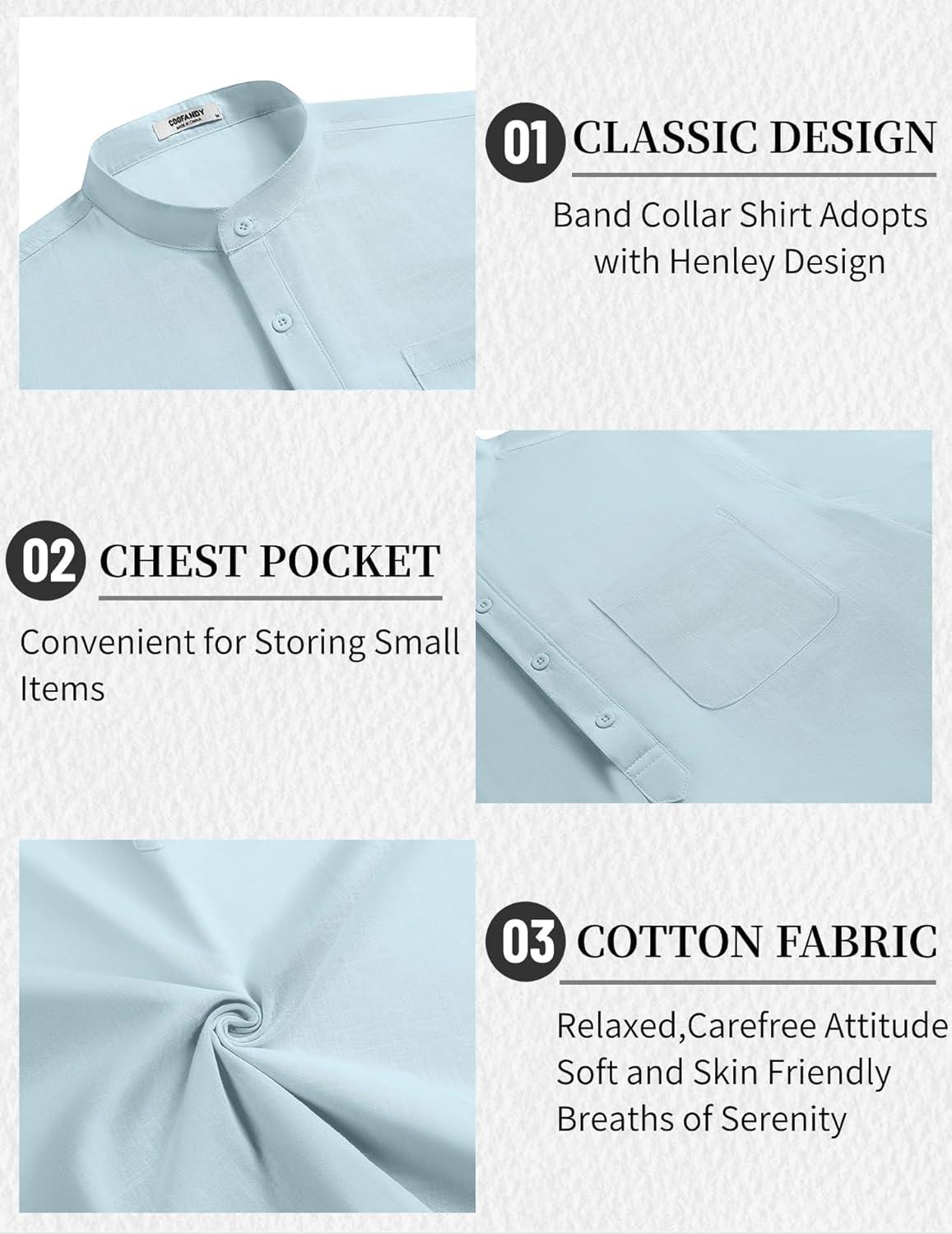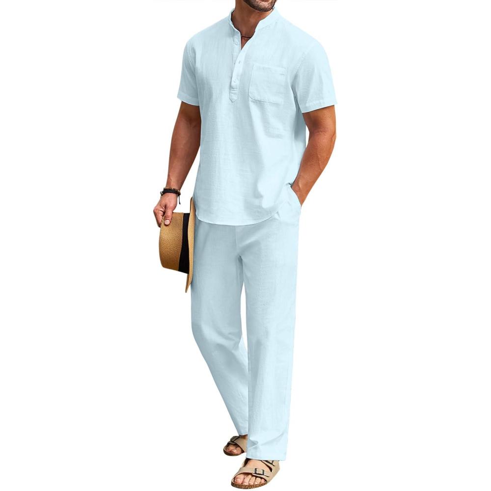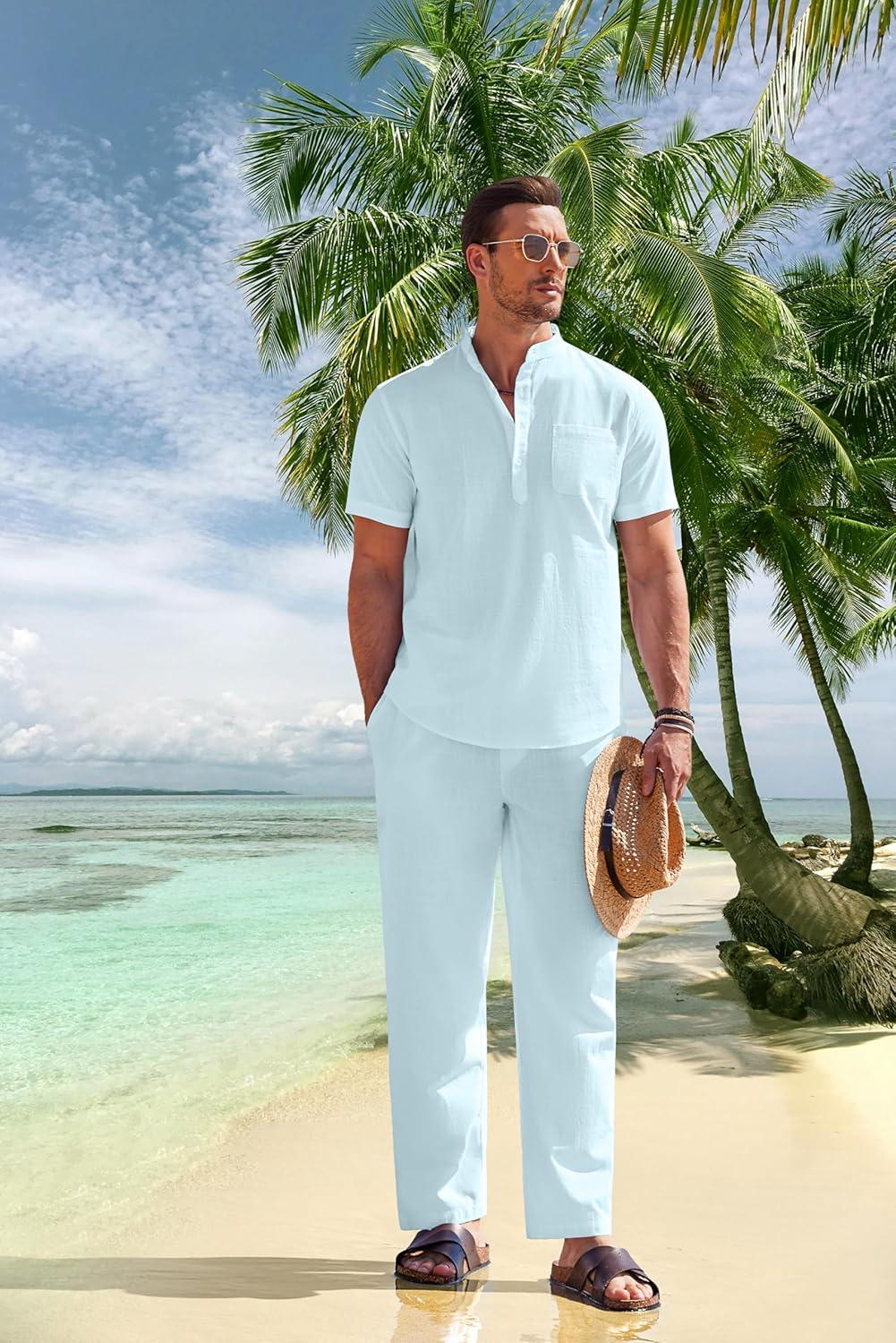 COOFANDY Men’s 2 Pieces Cotton Linen Set Casual Short Sleeve Henley Shirts Beach Yoga Pants Summer Outfits(Light Blue)