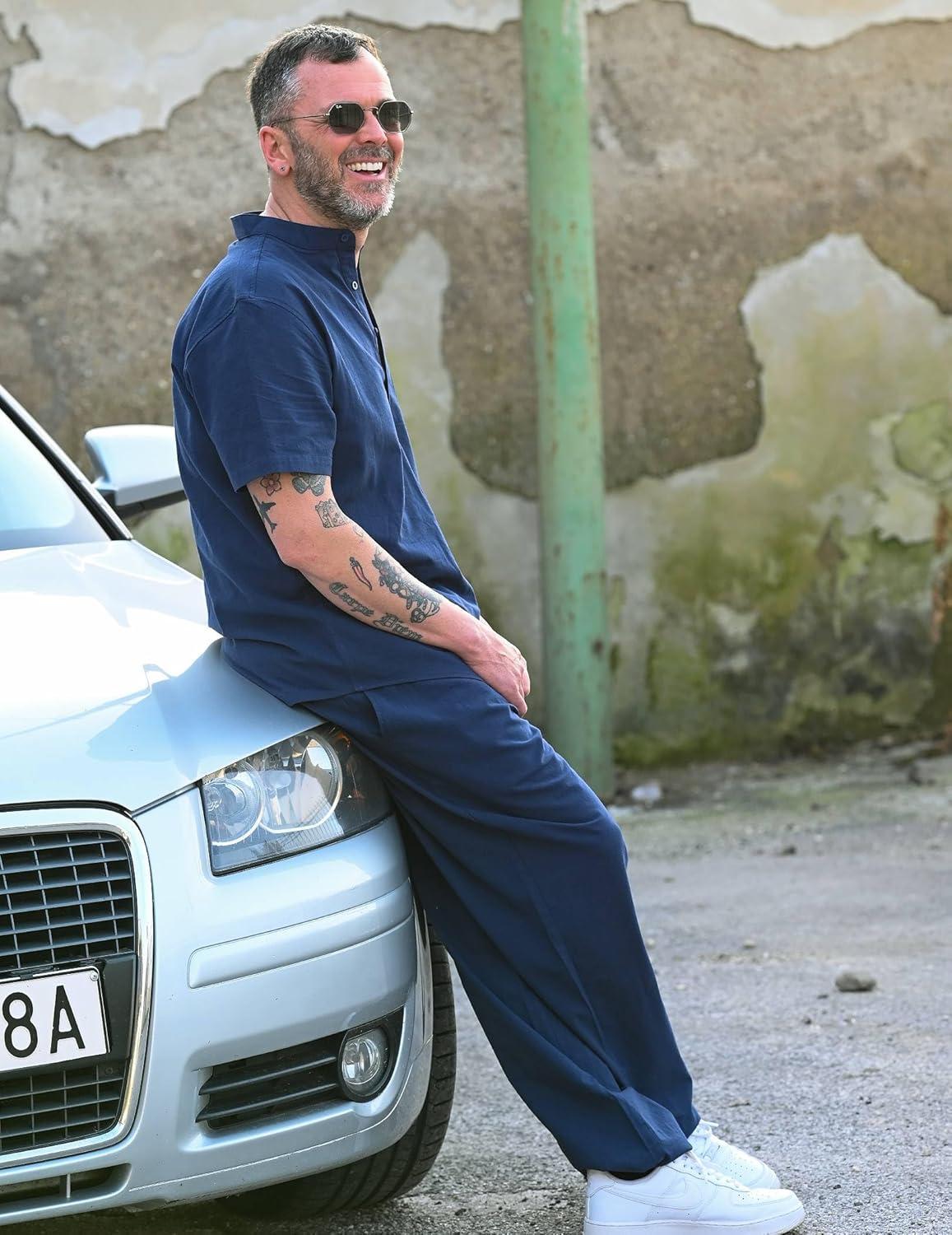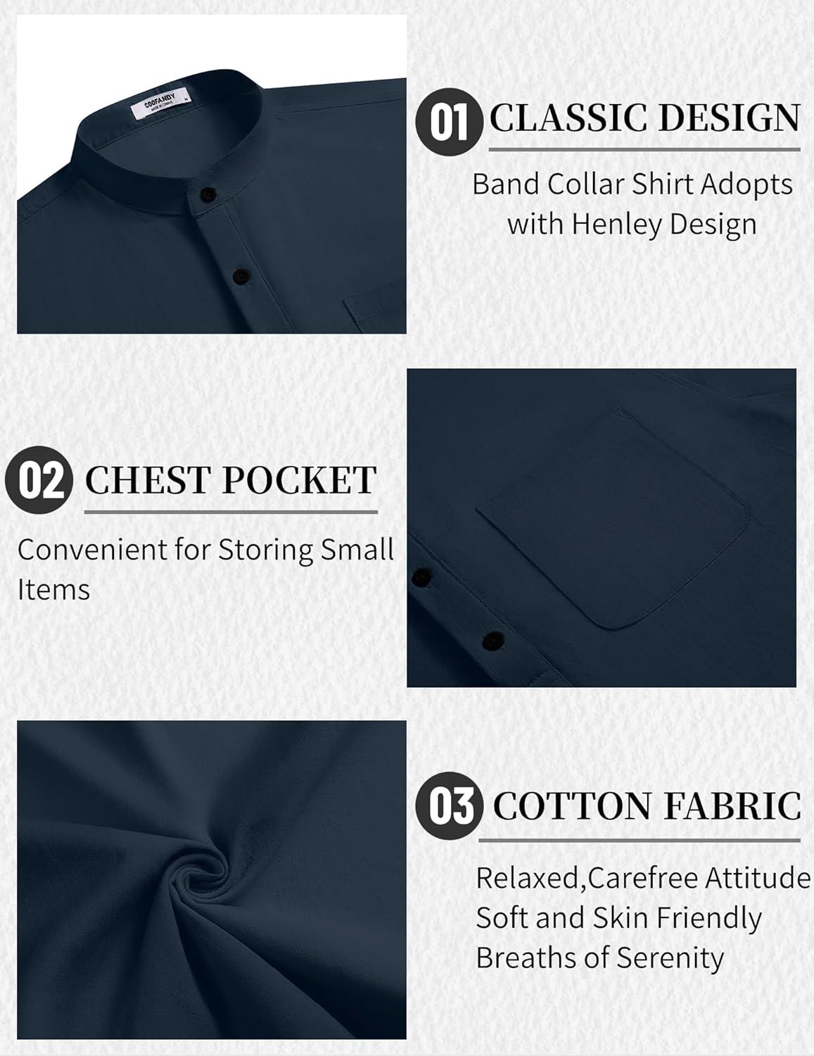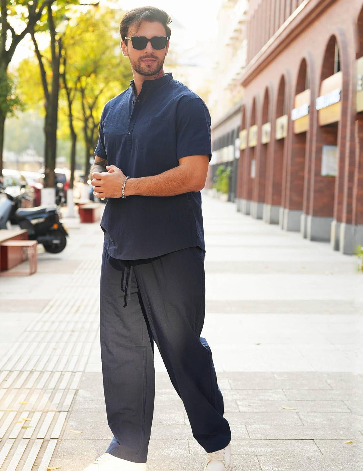 COOFANDY Men’s 2 Pieces Cotton Linen Set Casual Short Sleeve Henley Shirts Beach Yoga Pants Summer Outfits(Navy Blue)