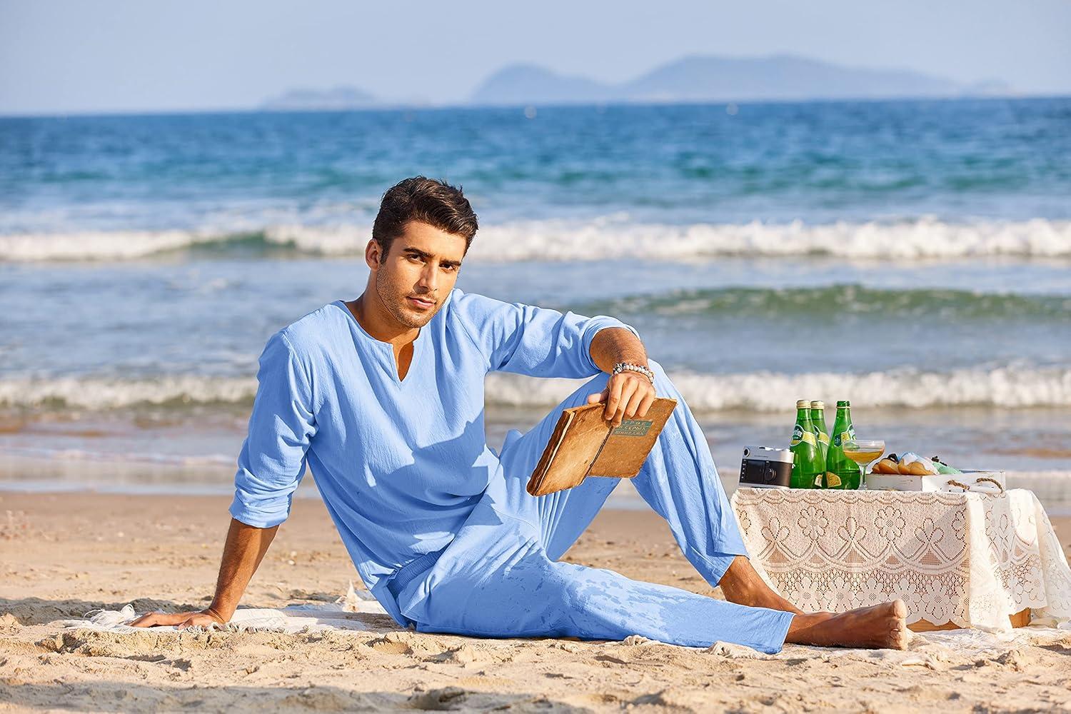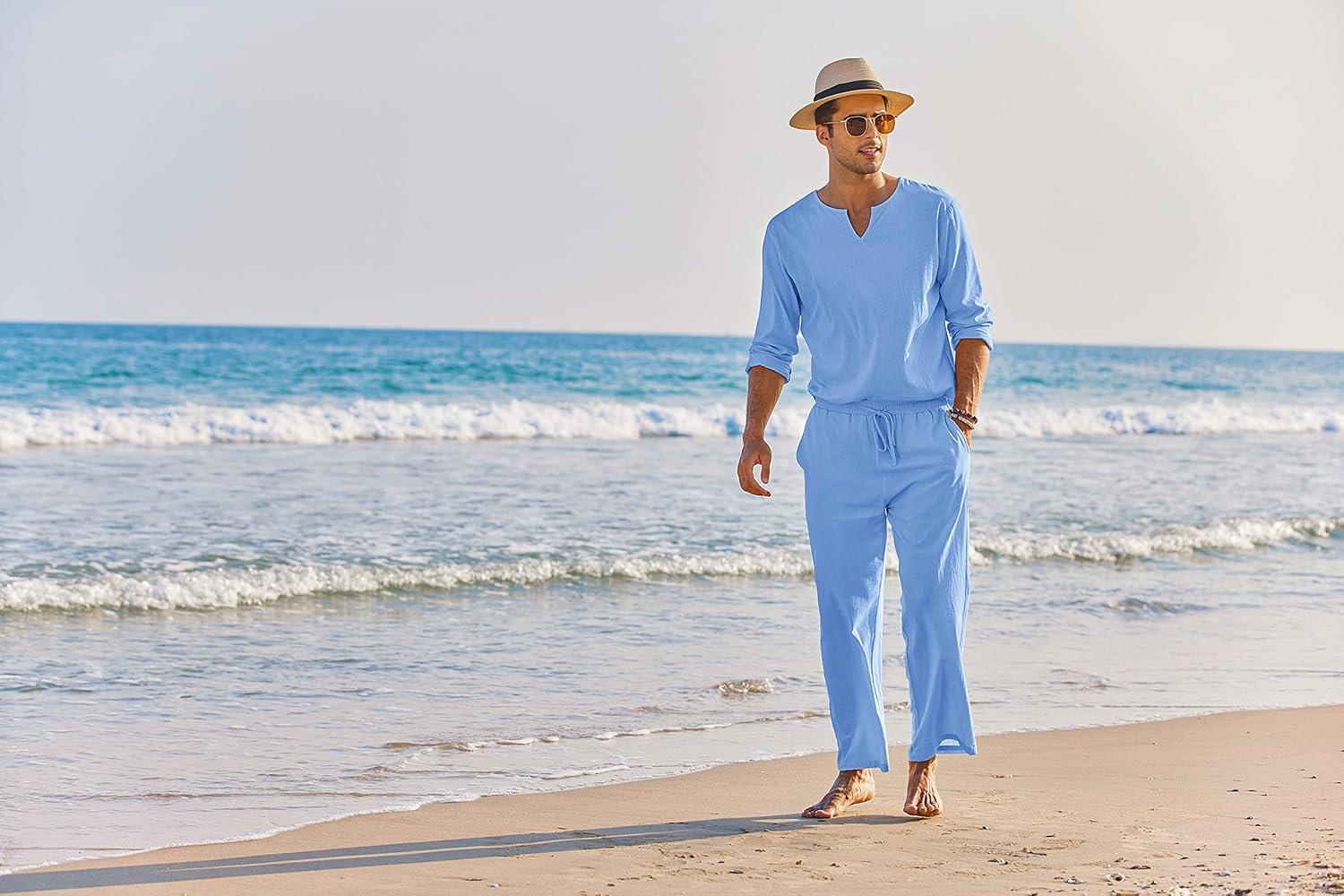 COOFANDY Men’s 2 Pieces Cotton Linen Set Henley Shirt Long Sleeve and Casual Beach Pants Summer Yoga Outfits(Light Blue)