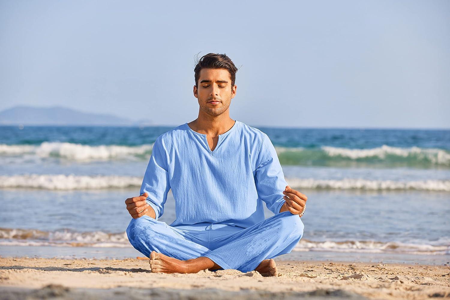 COOFANDY Men’s 2 Pieces Cotton Linen Set Henley Shirt Long Sleeve and Casual Beach Pants Summer Yoga Outfits(Blue)