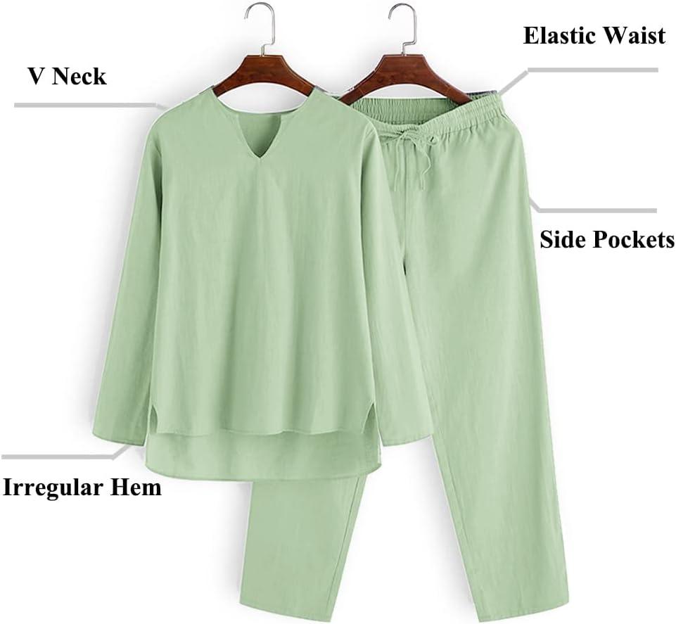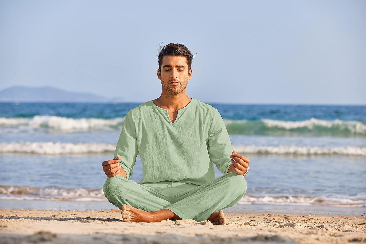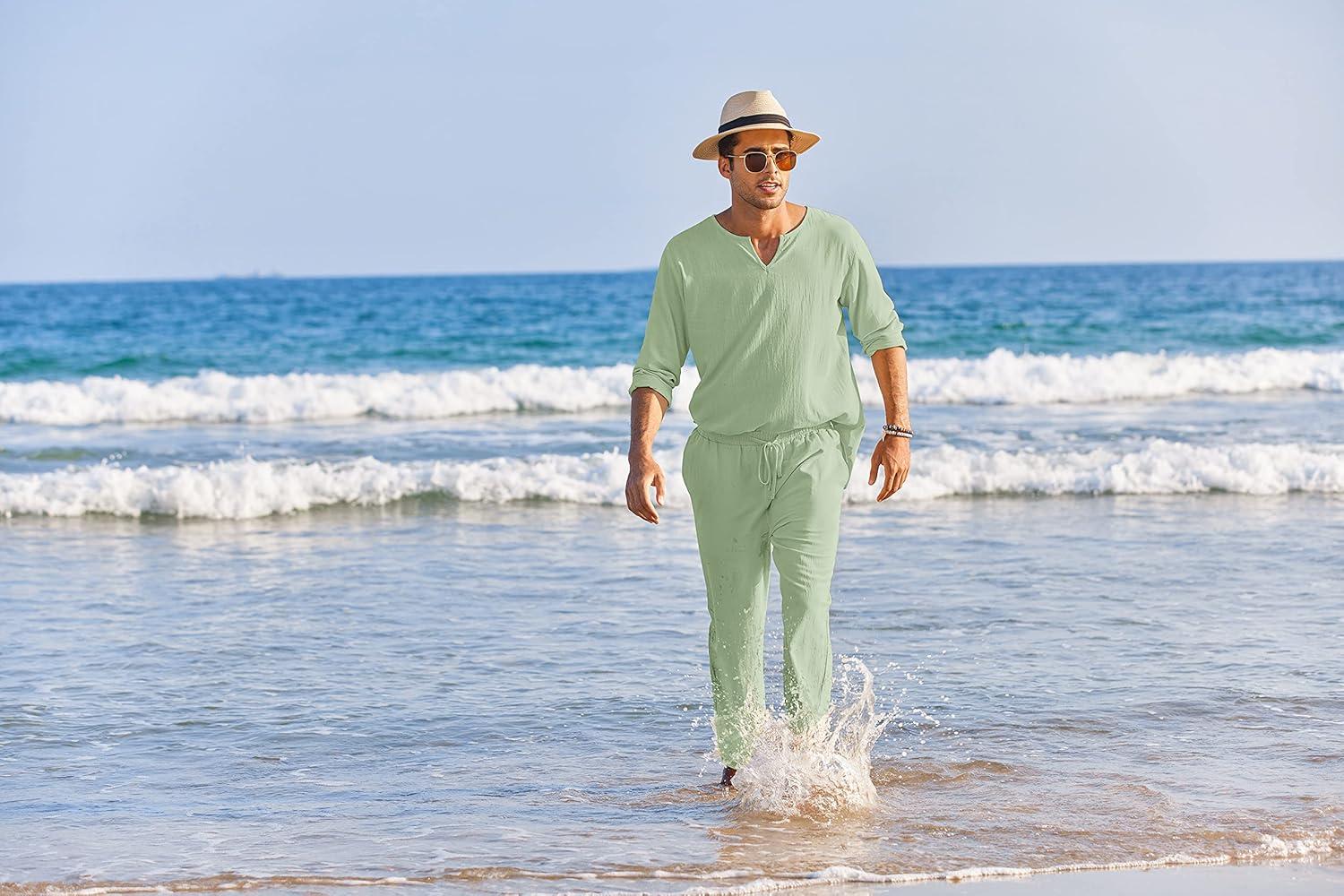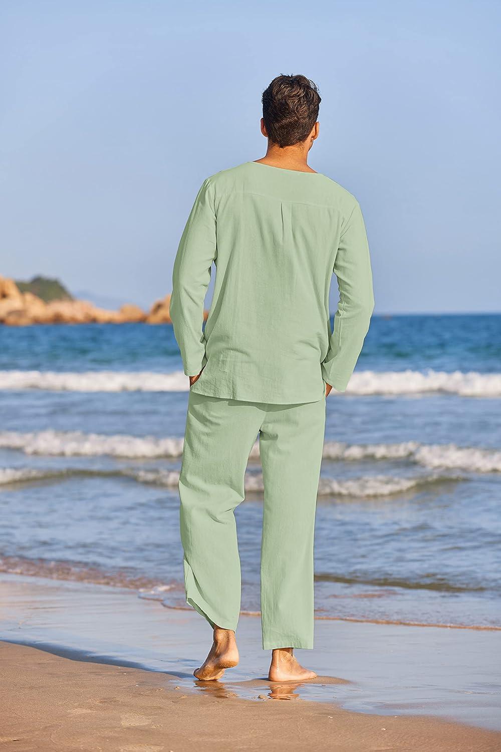 COOFANDY Men’s 2 Pieces Cotton Linen Set Henley Shirt Long Sleeve and Casual Beach Pants Summer Yoga Outfits(Light Green)