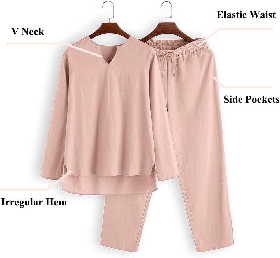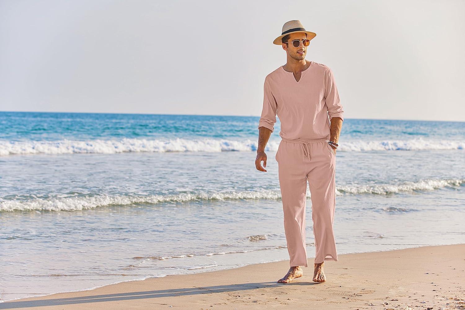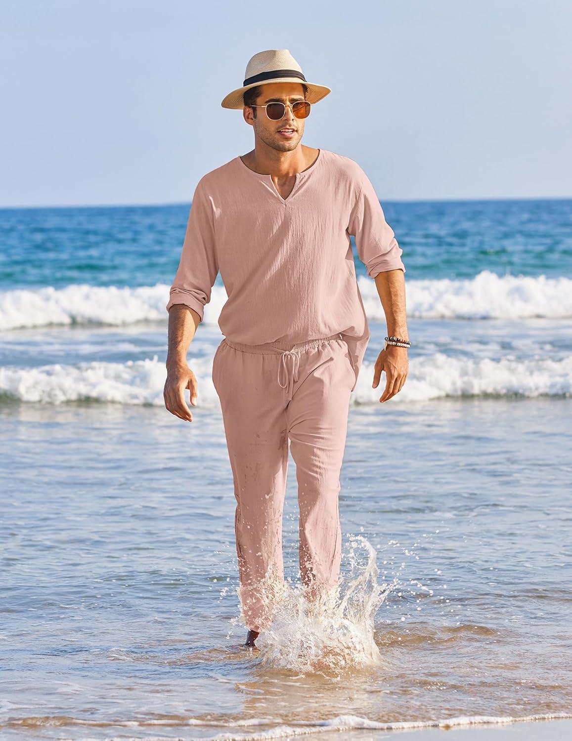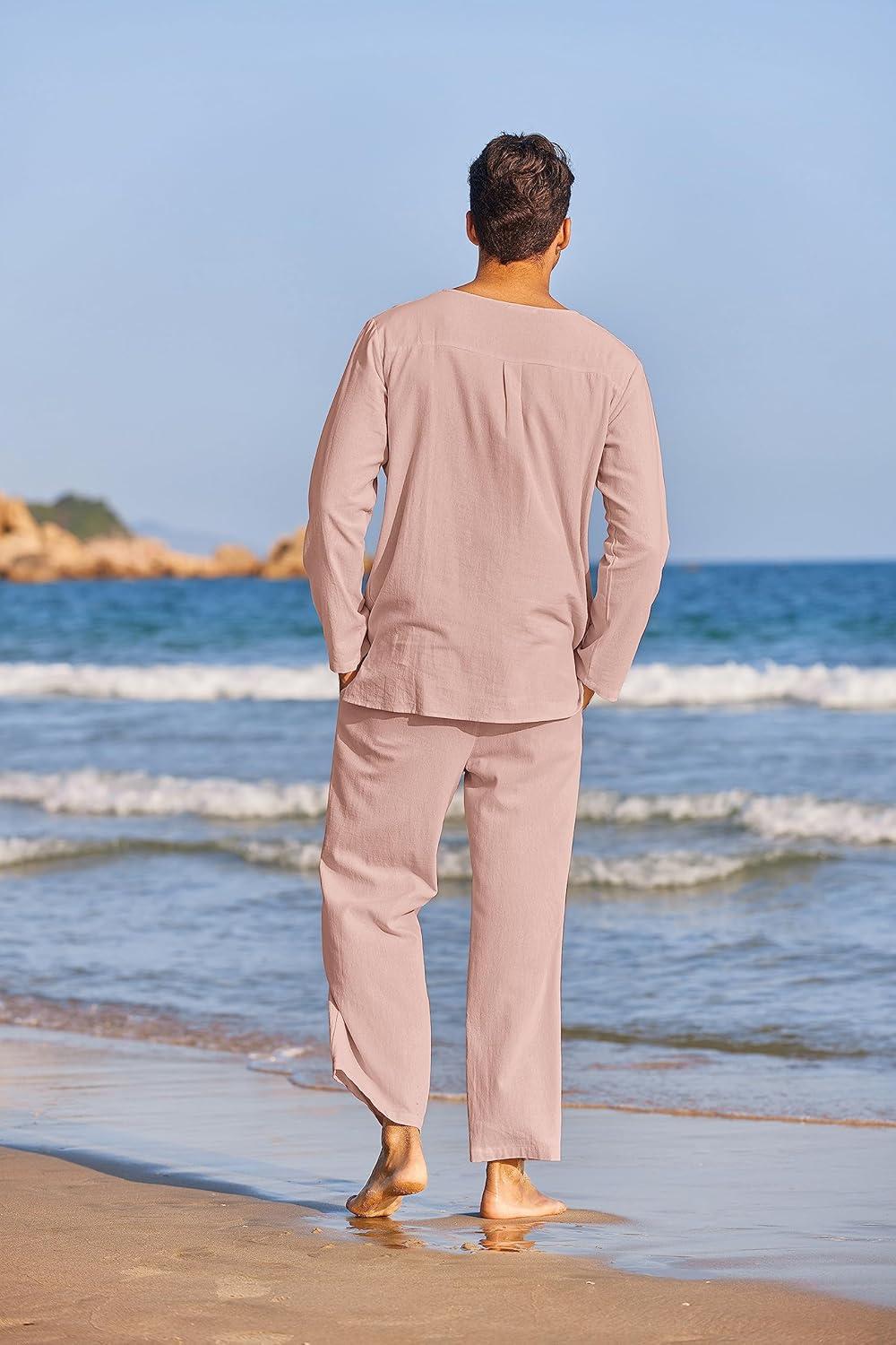 COOFANDY Men's 2 Pieces Cotton Linen Set Henley Shirt Long Sleeve and Casual Beach Pants Summer Yoga Outfits(Pink)