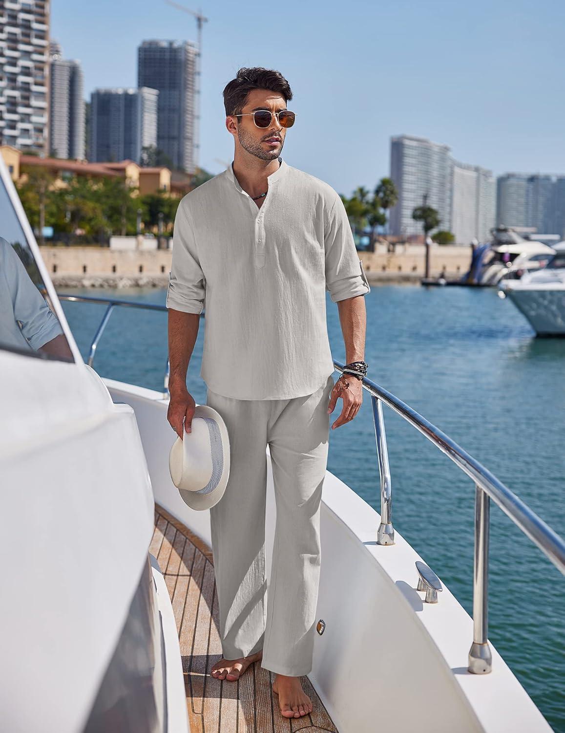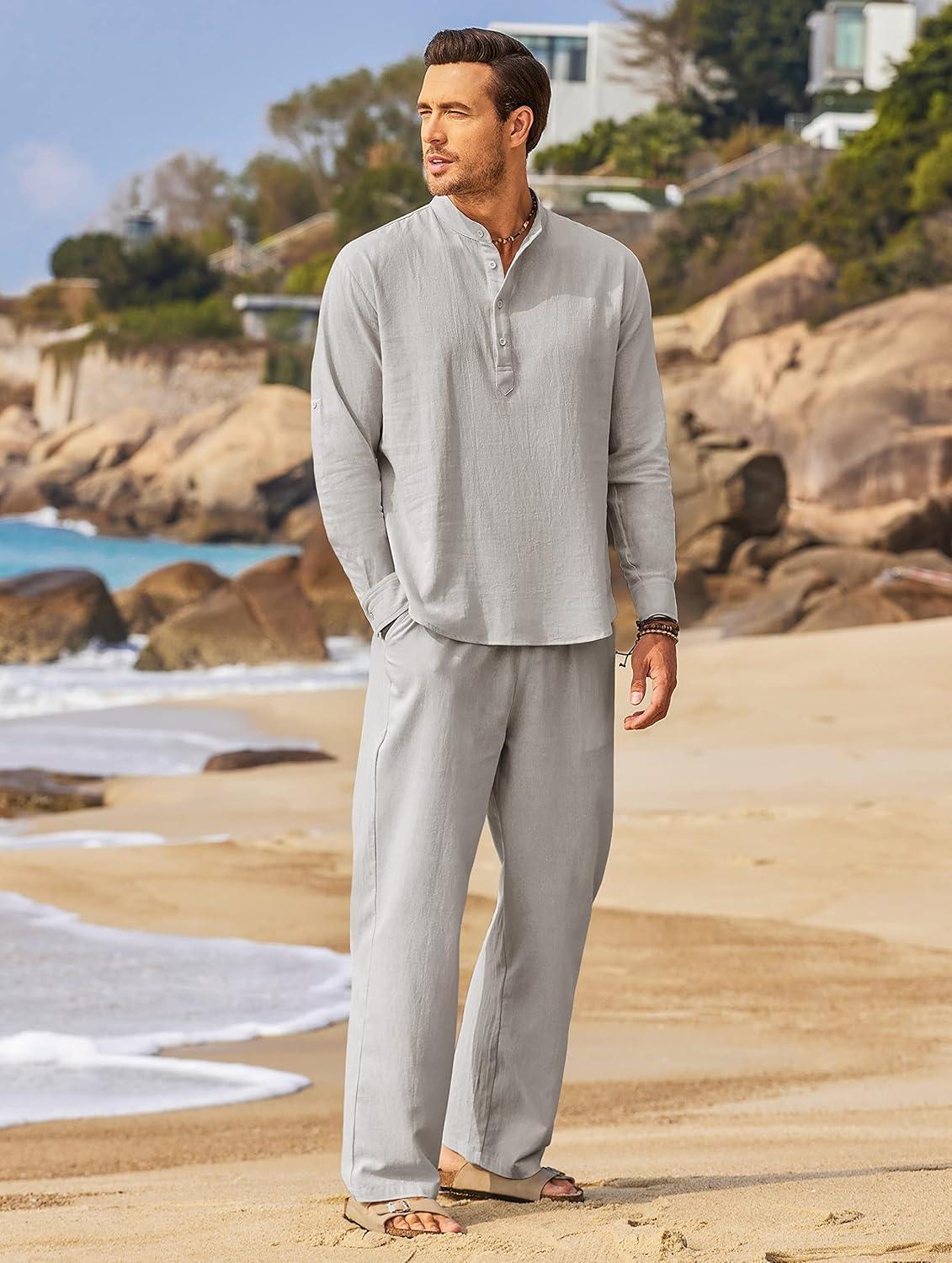 COOFANDY Men's 2 Pieces Cotton Linen Set Long Sleeve Henley Shirts Casual Beach Pants With Pockets Summer Yoga Outfits(Grey)