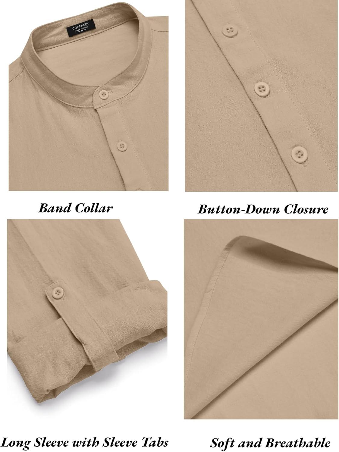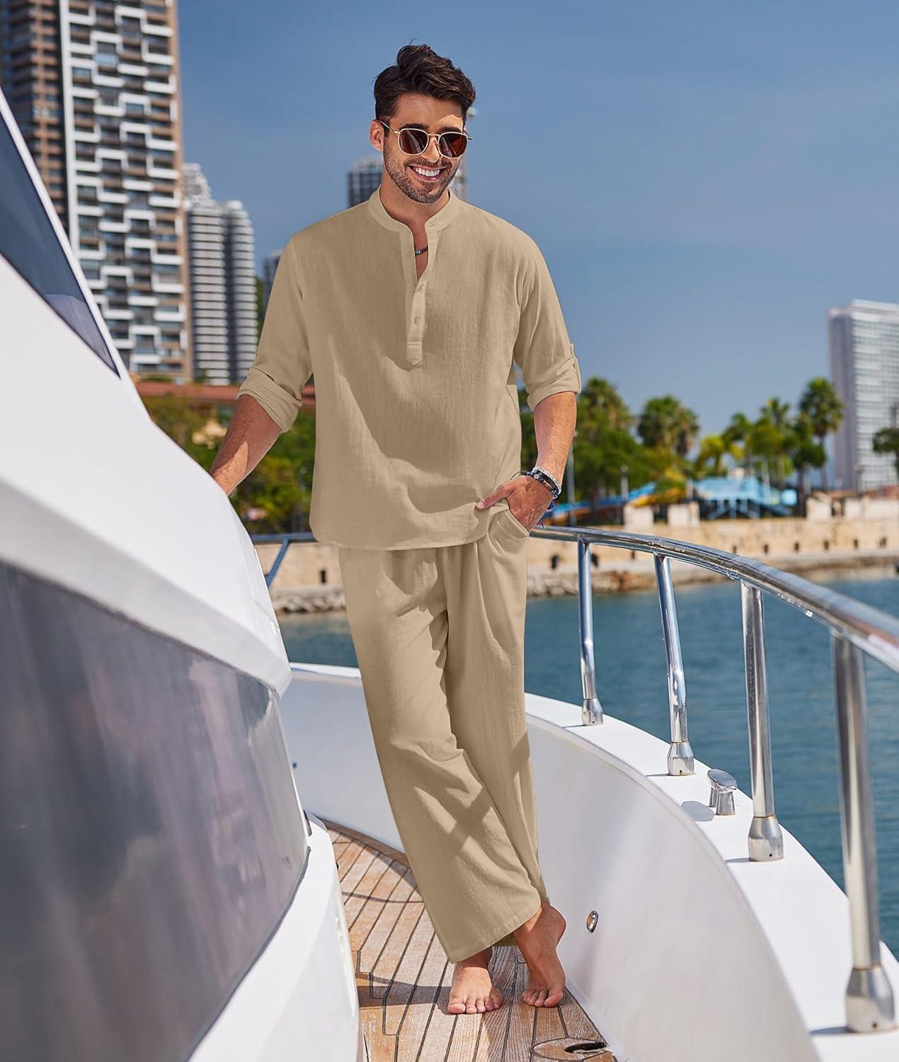 COOFANDY Men's 2 Pieces Cotton Linen Set Long Sleeve Henley Shirts Casual Beach Pants With Pockets Summer Yoga Outfits(Khaki)