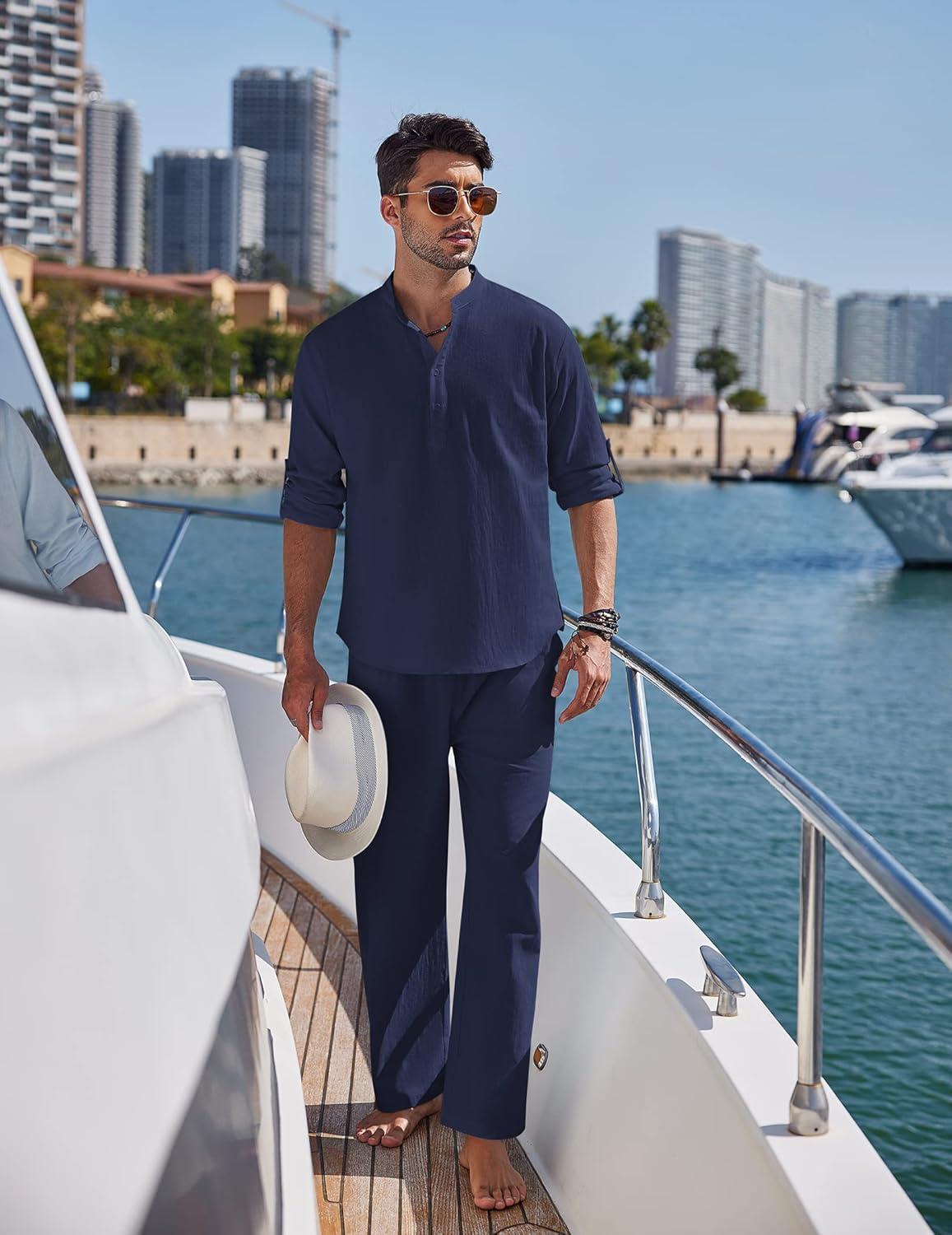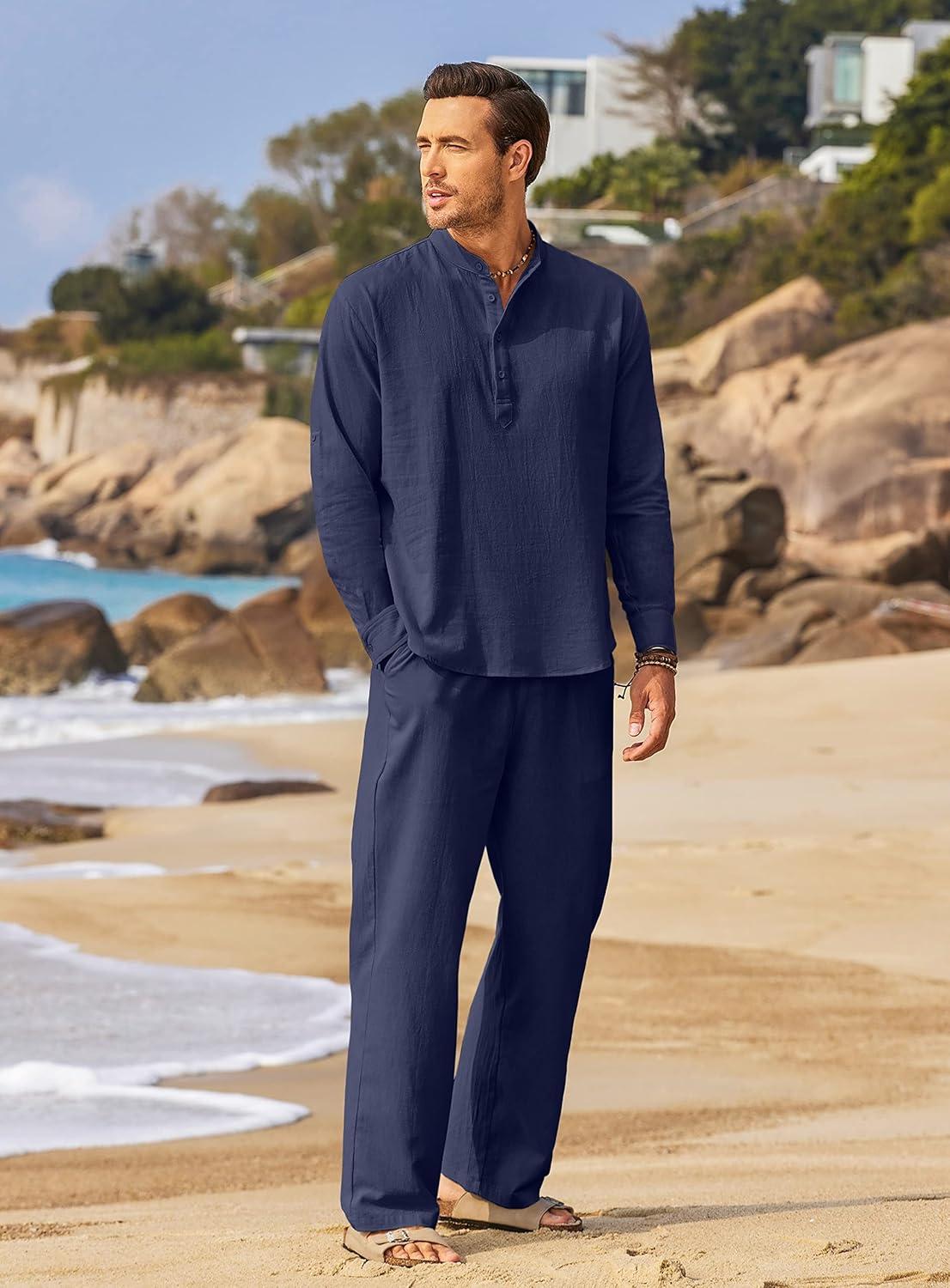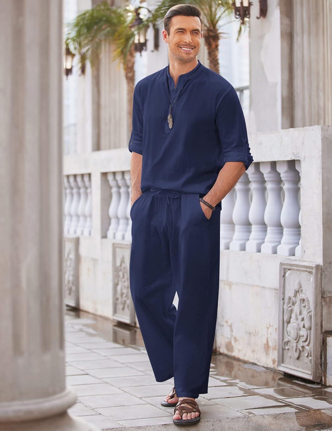COOFANDY Men's 2 Pieces Cotton Linen Set Long Sleeve Henley Shirts Casual Beach Pants With Pockets Summer Yoga Outfits(Navy Blue)
