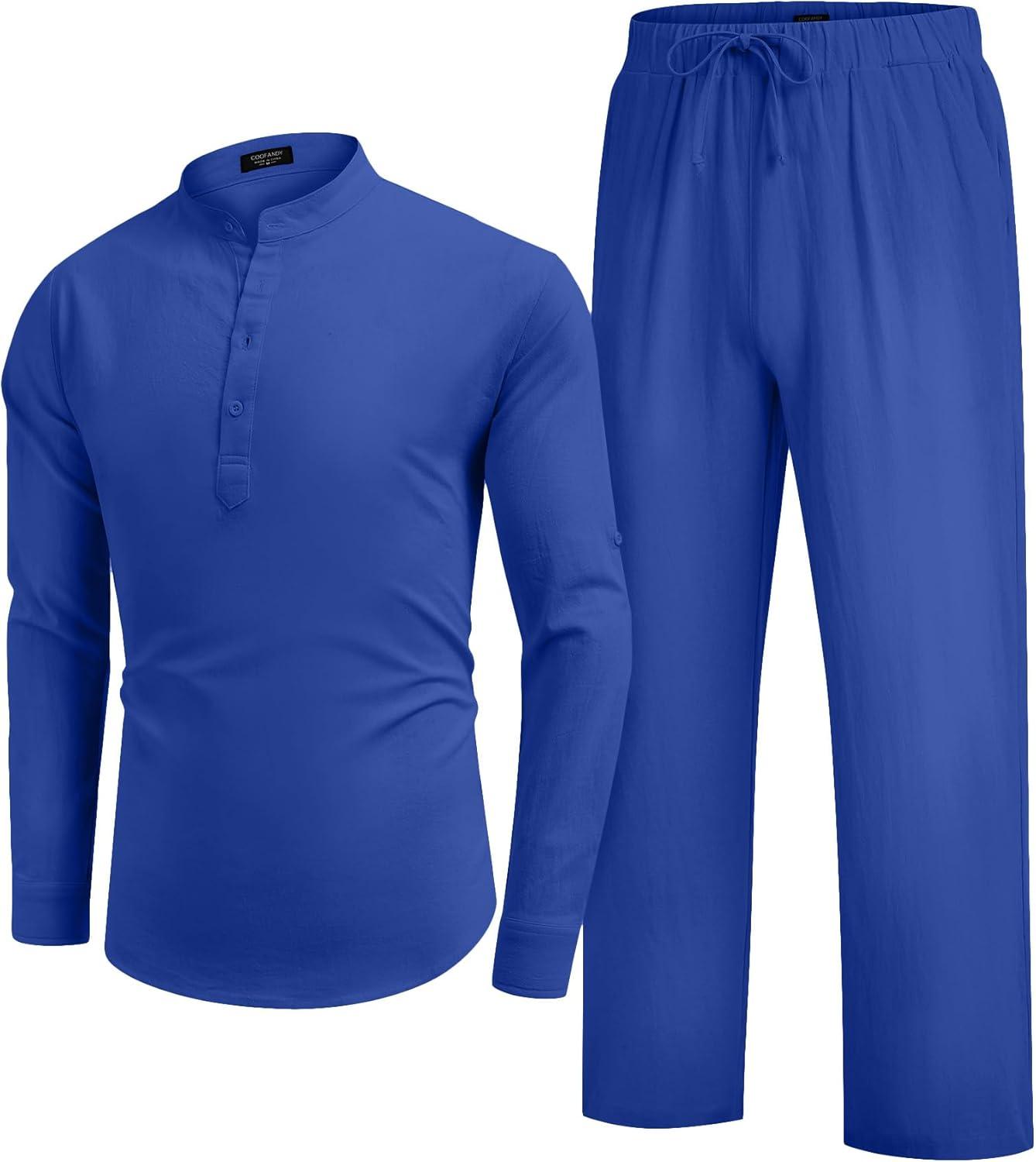 COOFANDY Men's 2 Pieces Cotton Linen Set Long Sleeve Henley Shirts Casual Beach Pants With Pockets Summer Yoga Outfits(Royal Blue)