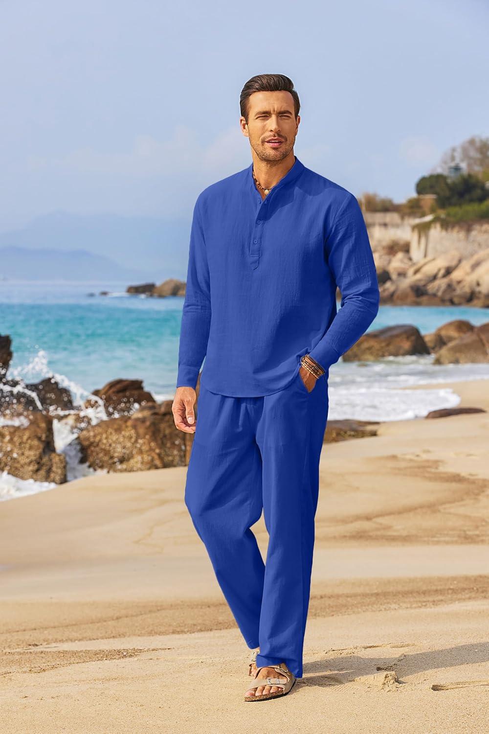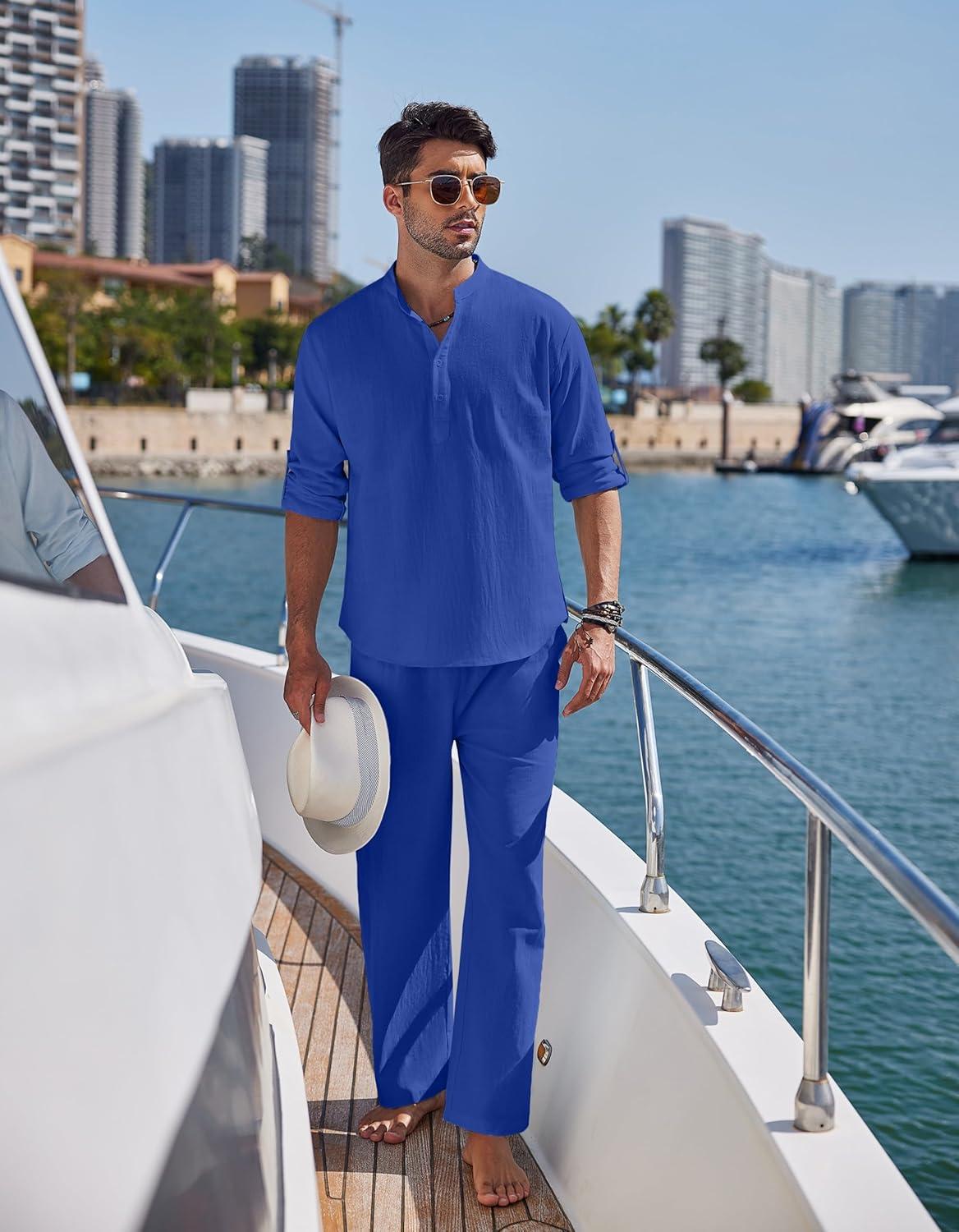COOFANDY Men’s 2 Pieces Cotton Linen Set Long Sleeve Henley Shirts Casual Beach Pants With Pockets Summer Yoga Outfits(Royal Blue)
