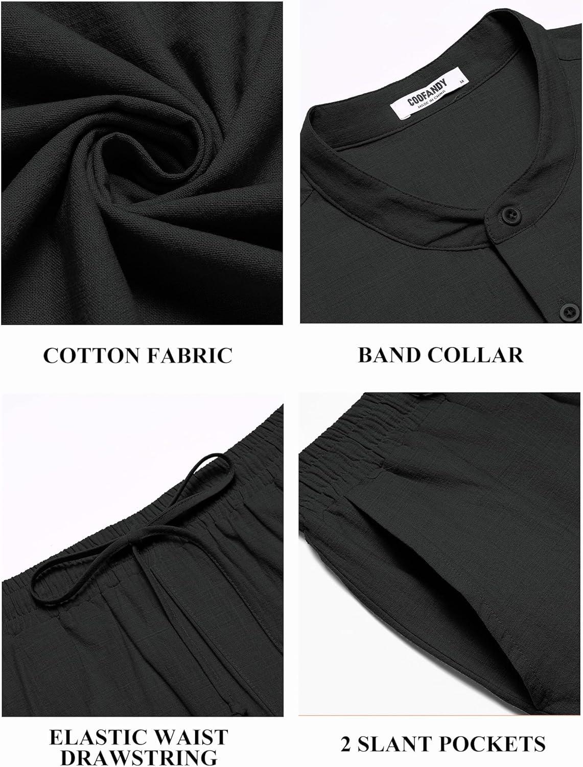 COOFANDY Mens 2 Pieces Cotton Linen Sets Short Sleeve Casual Henley Shirt Summer Beach Pants Lounge Vacation Outfits Set(Black)