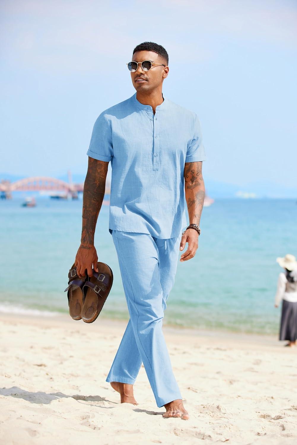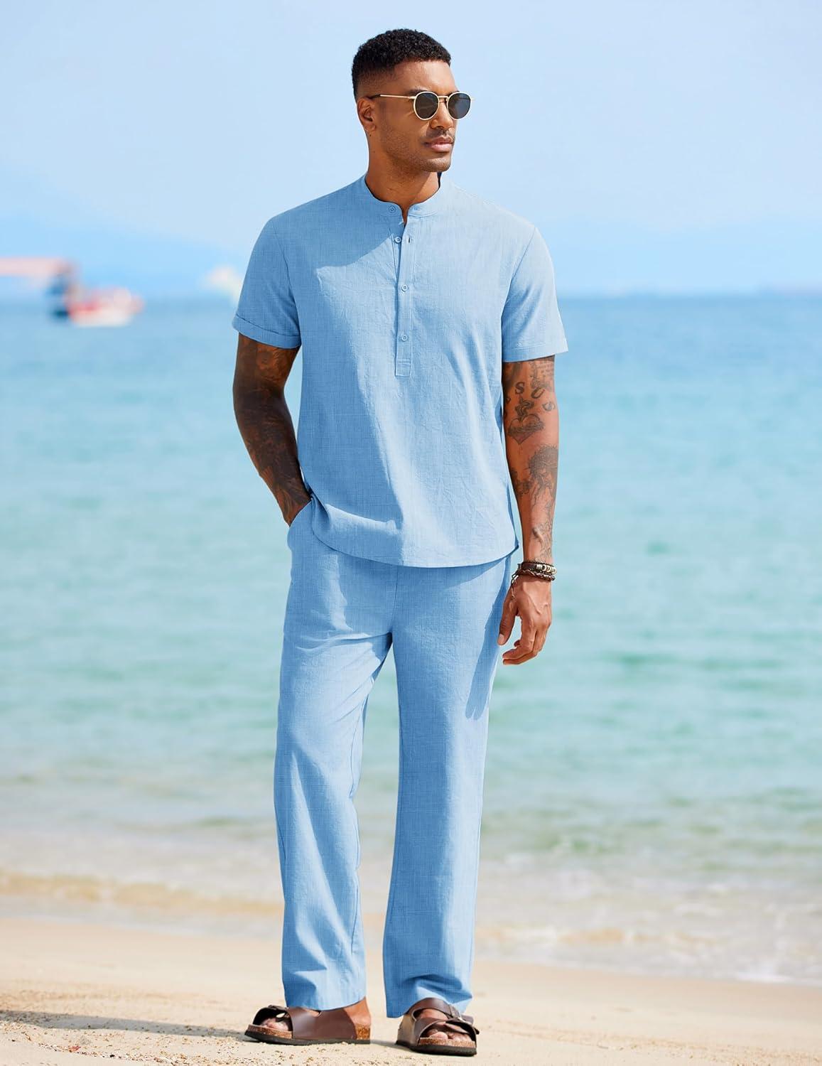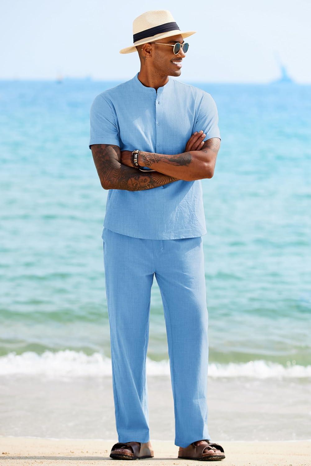 COOFANDY Mens 2 Pieces Cotton Linen Sets Short Sleeve Casual Henley Shirt Summer Beach Pants Lounge Vacation Outfits Set(Light Blue)