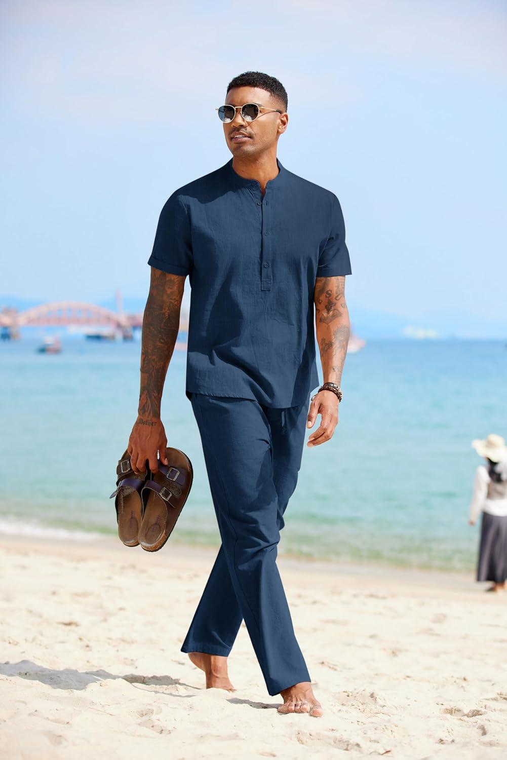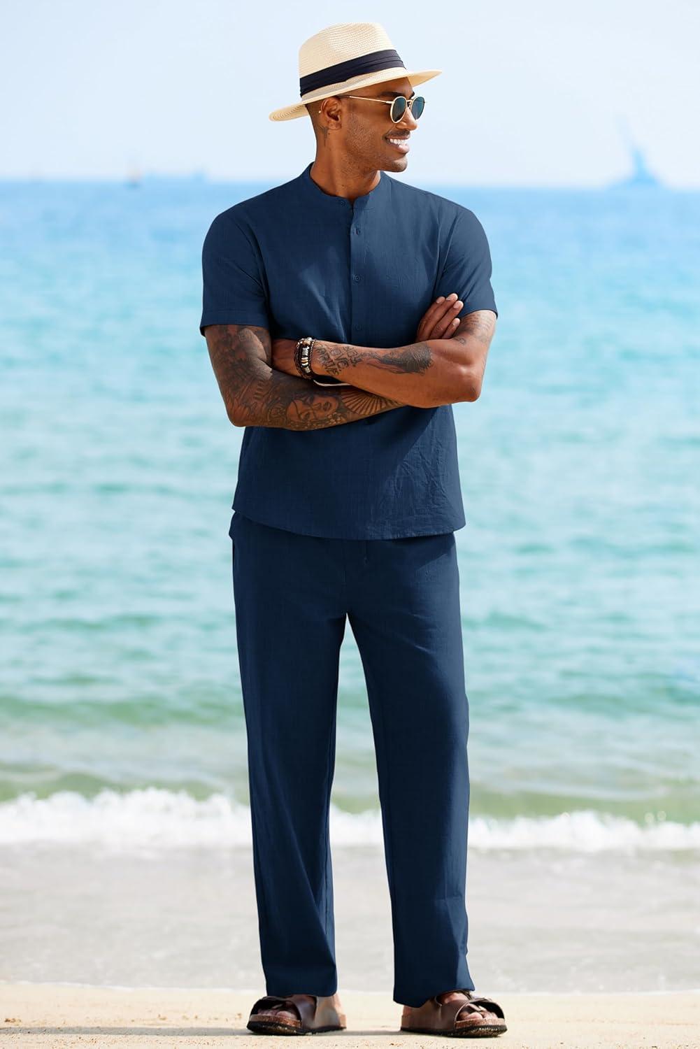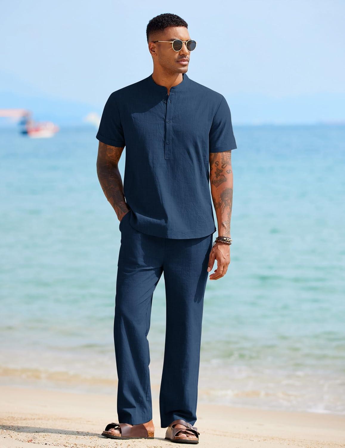 COOFANDY Mens 2 Pieces Cotton Linen Sets Short Sleeve Casual Henley Shirt Summer Beach Pants Lounge Vacation Outfits Set(Navy Blue)