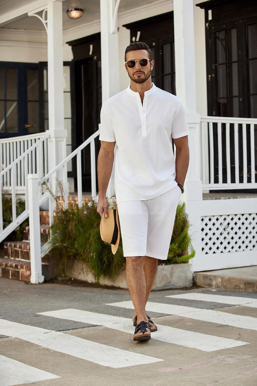 COOFANDY Men’s 2 Pieces Linen Set Casual Henley Shirts Short Sleeve Beach Yoga Shorts Summer Pants Outfits(01-white)