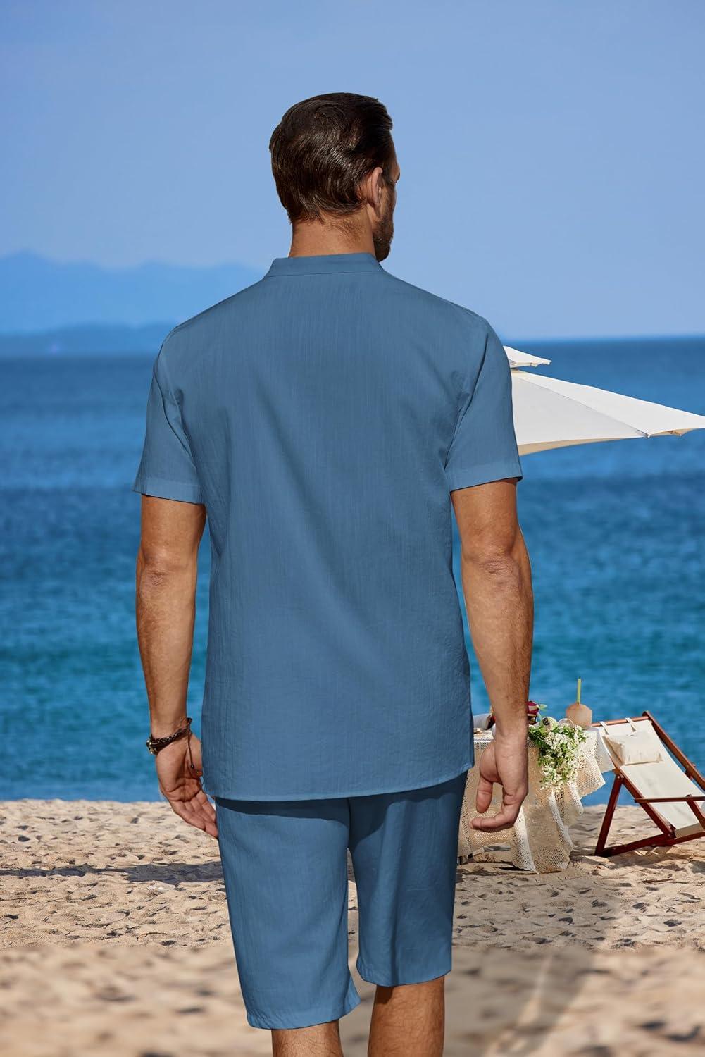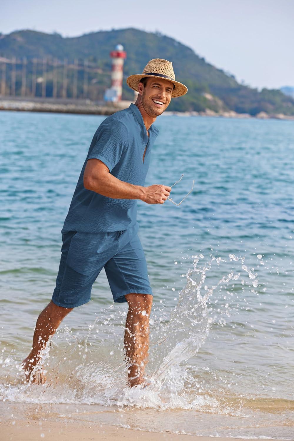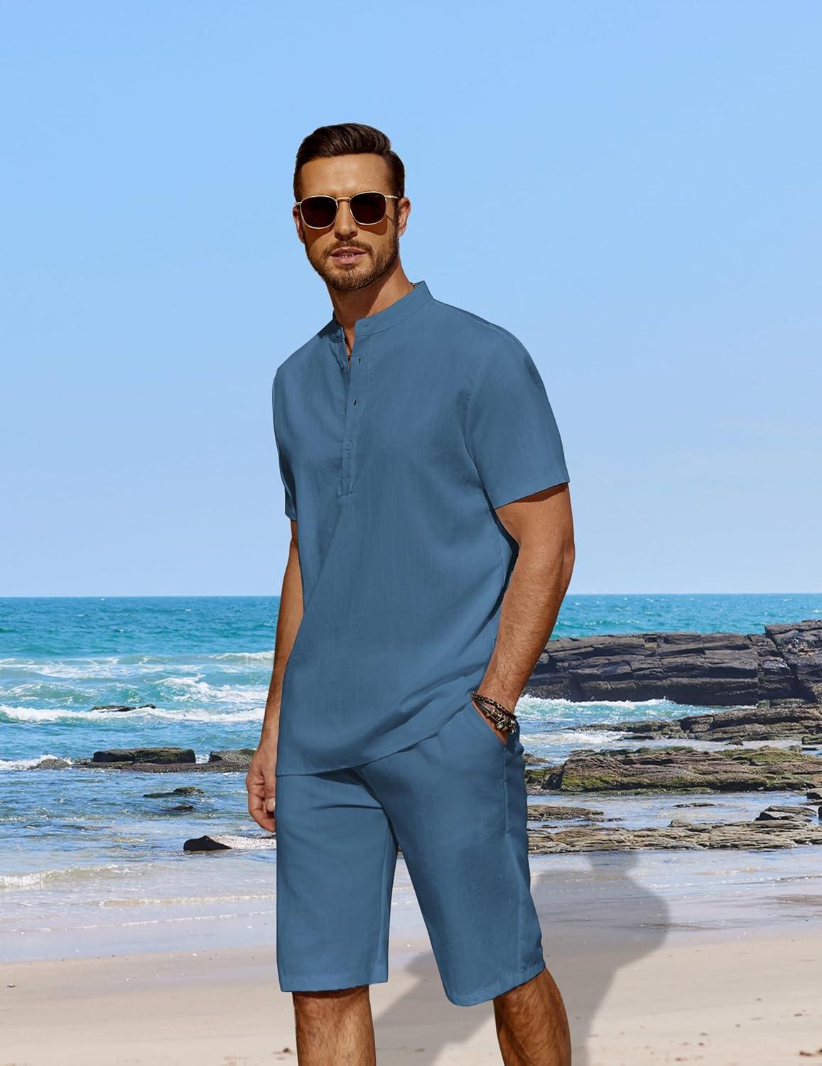 COOFANDY Men’s 2 Pieces Linen Set Casual Henley Shirts Short Sleeve Beach Yoga Shorts Summer Pants Outfits(Light Blue)