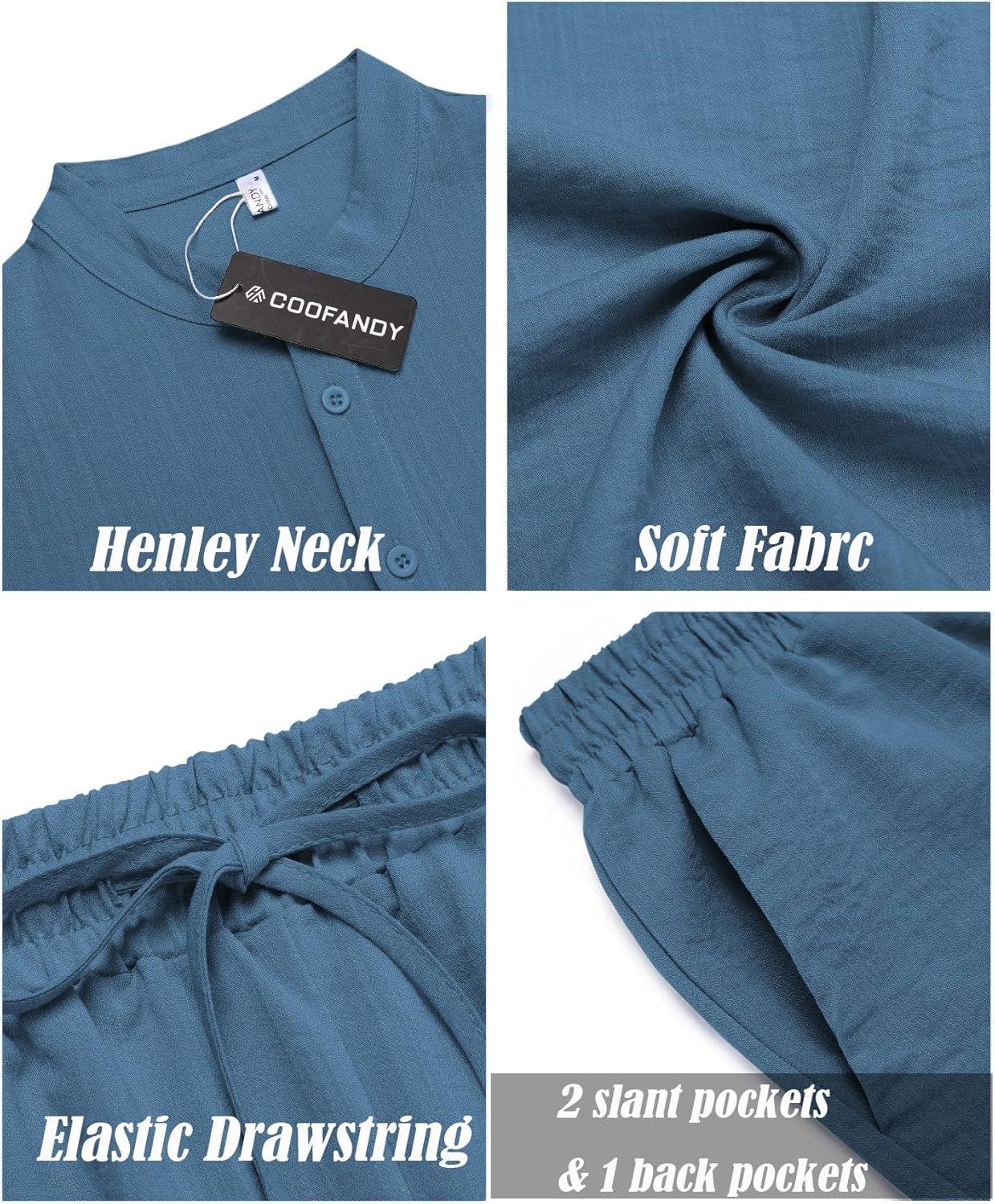 COOFANDY Men's 2 Pieces Linen Set Casual Henley Shirts Short Sleeve Beach Yoga Shorts Summer Pants Outfits(Dark Blue)