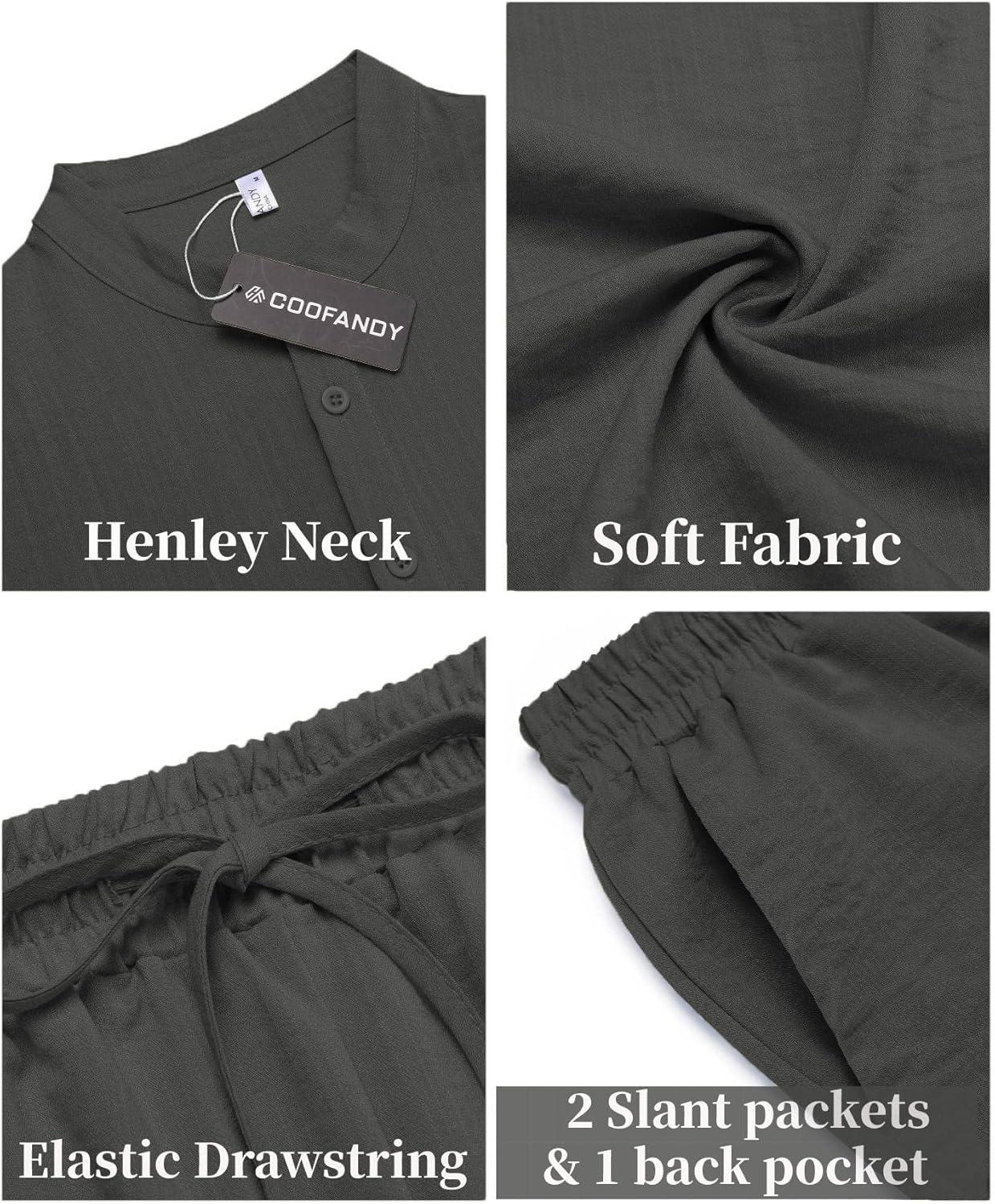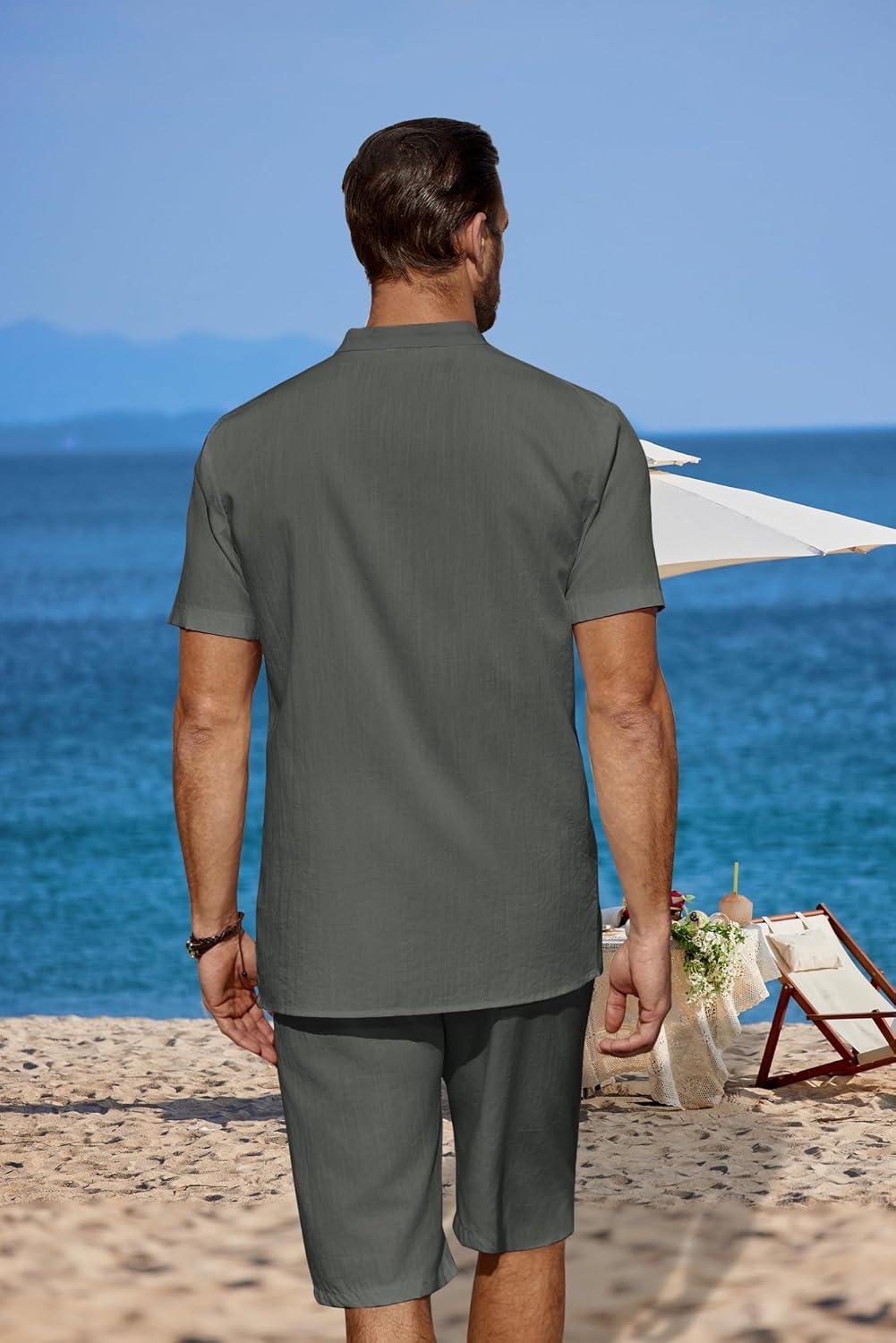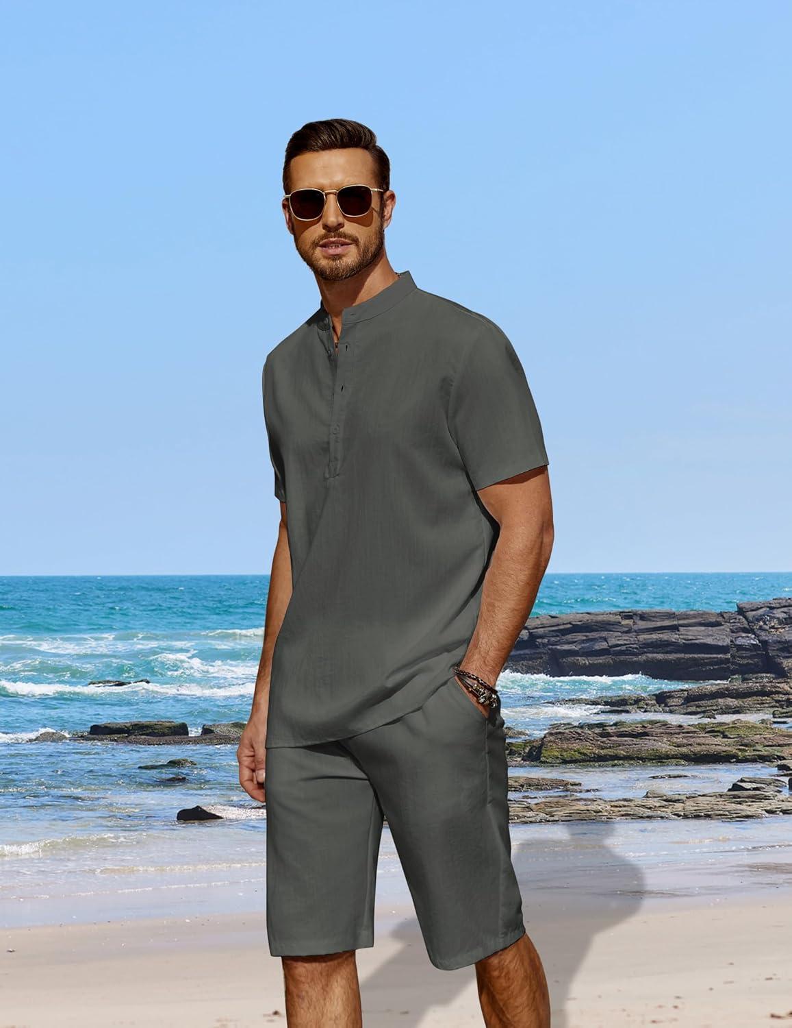 COOFANDY Men’s 2 Pieces Linen Set Casual Henley Shirts Short Sleeve Beach Yoga Shorts Summer Pants Outfits(Dark Grey)