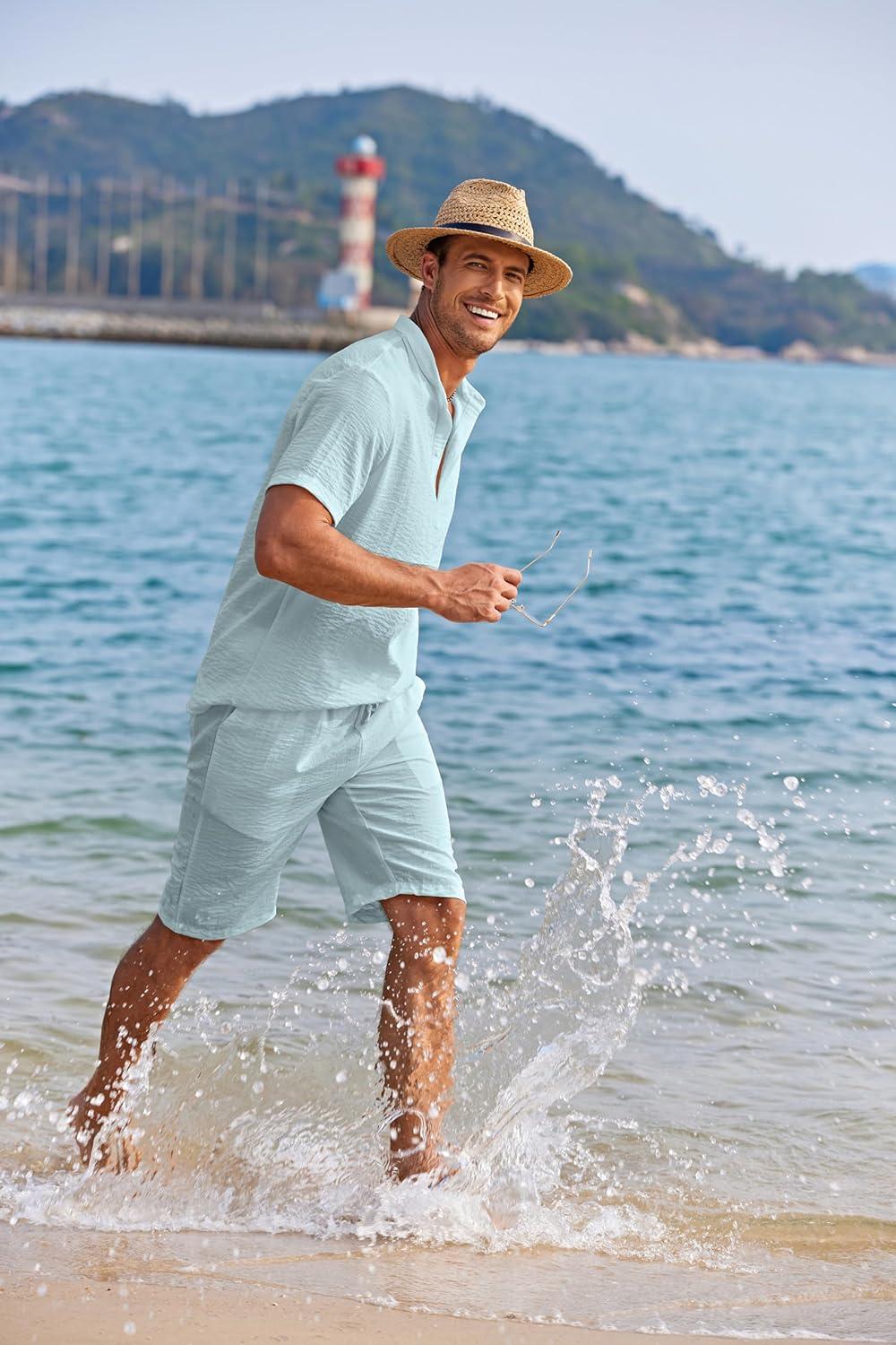 COOFANDY Men’s 2 Pieces Linen Set Casual Henley Shirts Short Sleeve Beach Yoga Shorts Summer Pants Outfits(Light Blue)