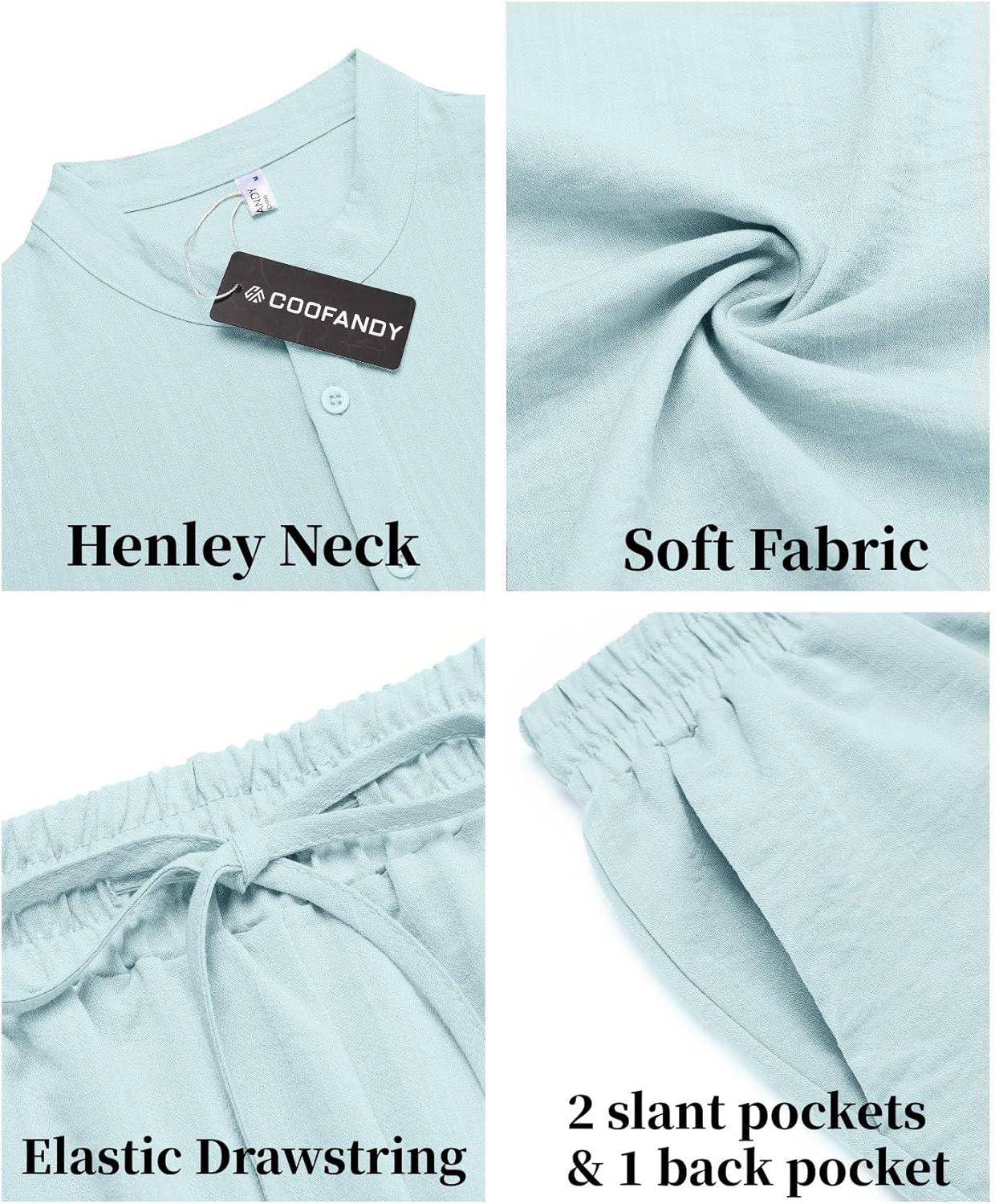 COOFANDY Men's 2 Pieces Linen Set Casual Henley Shirts Short Sleeve Beach Yoga Shorts Summer Pants Outfits(Light Blue)