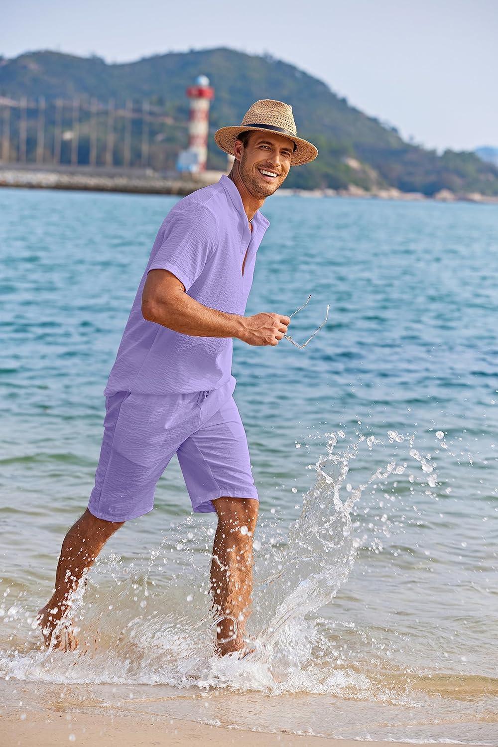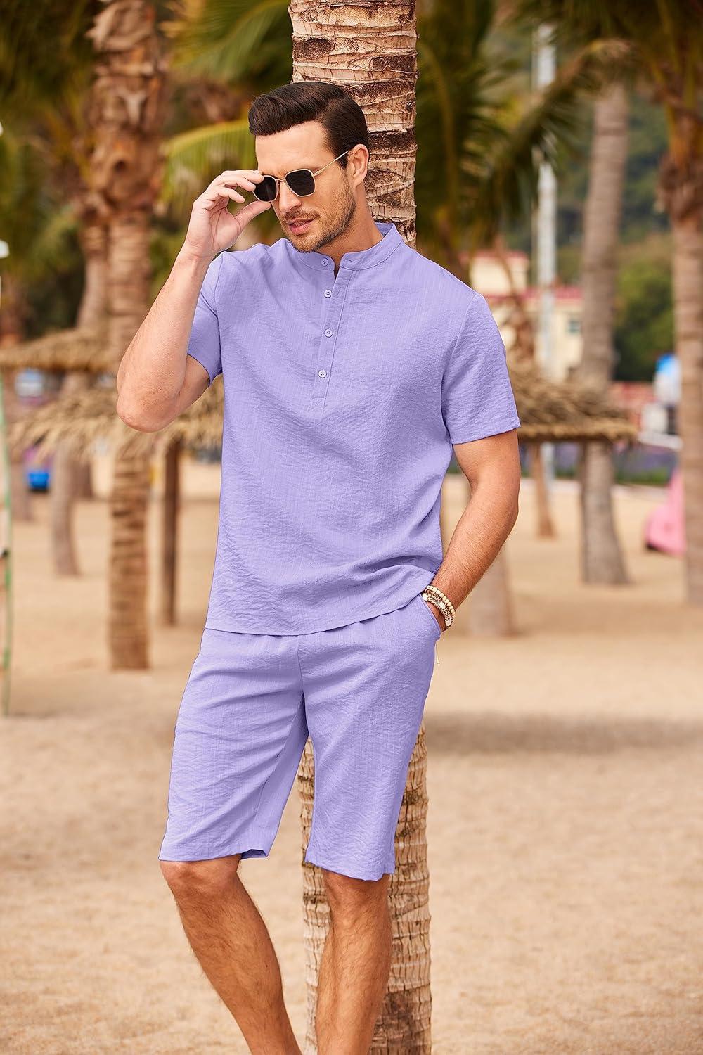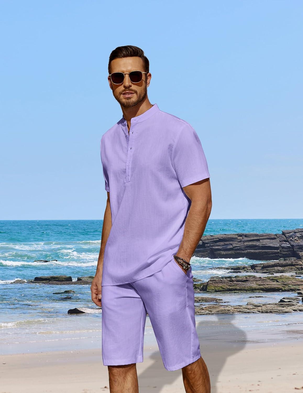 COOFANDY Men’s 2 Pieces Linen Set Casual Henley Shirts Short Sleeve Beach Yoga Shorts Summer Pants Outfits(Purple)