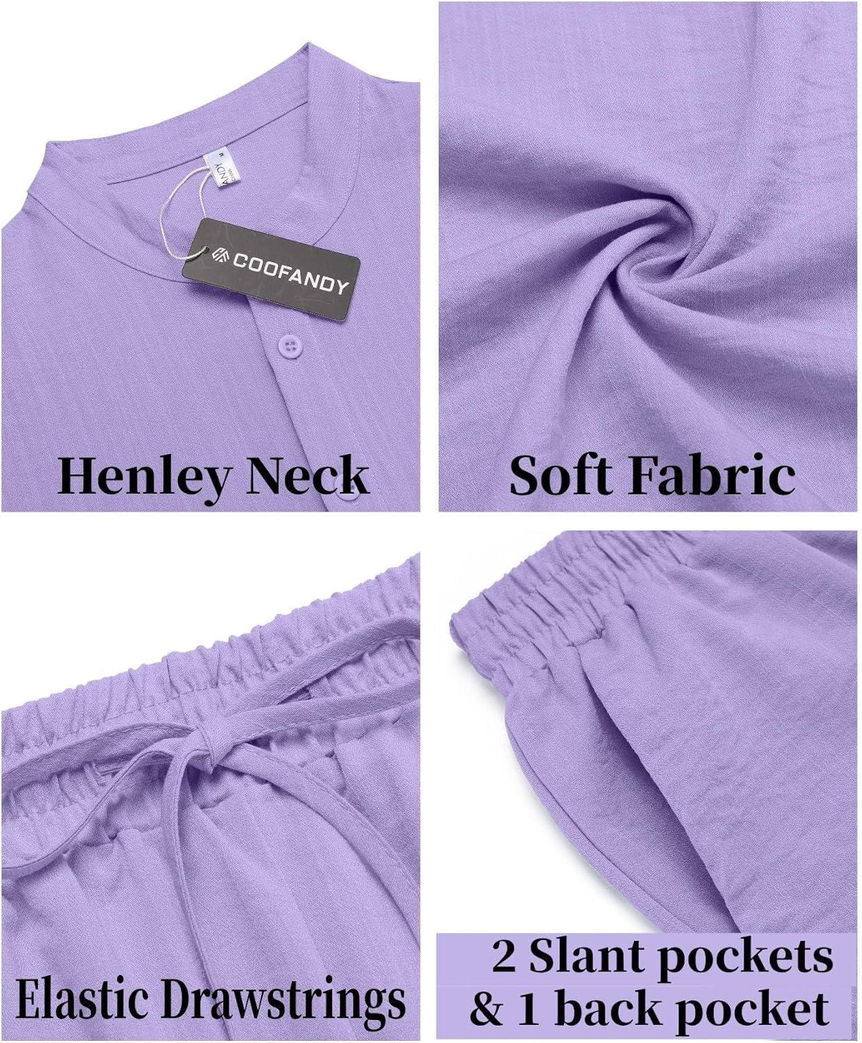 imageCOOFANDY Mens 2 Pieces Linen Set Casual Henley Shirts Short Sleeve Beach Yoga Shorts Summer Pants OutfitsPurple