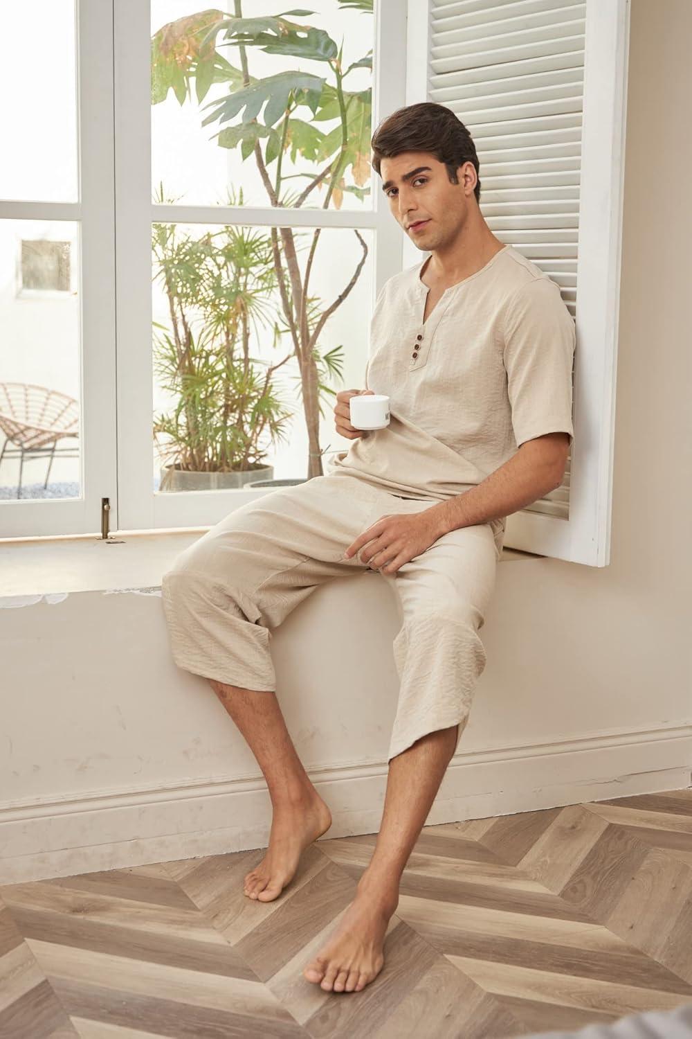 COOFANDY Men's 2 Pieces Linen Set Henley Shirt Short Sleeve and Harem Capri Pants Wide Leg Baggy Beach Yoga Trousers Outfits(02-light Khaki)