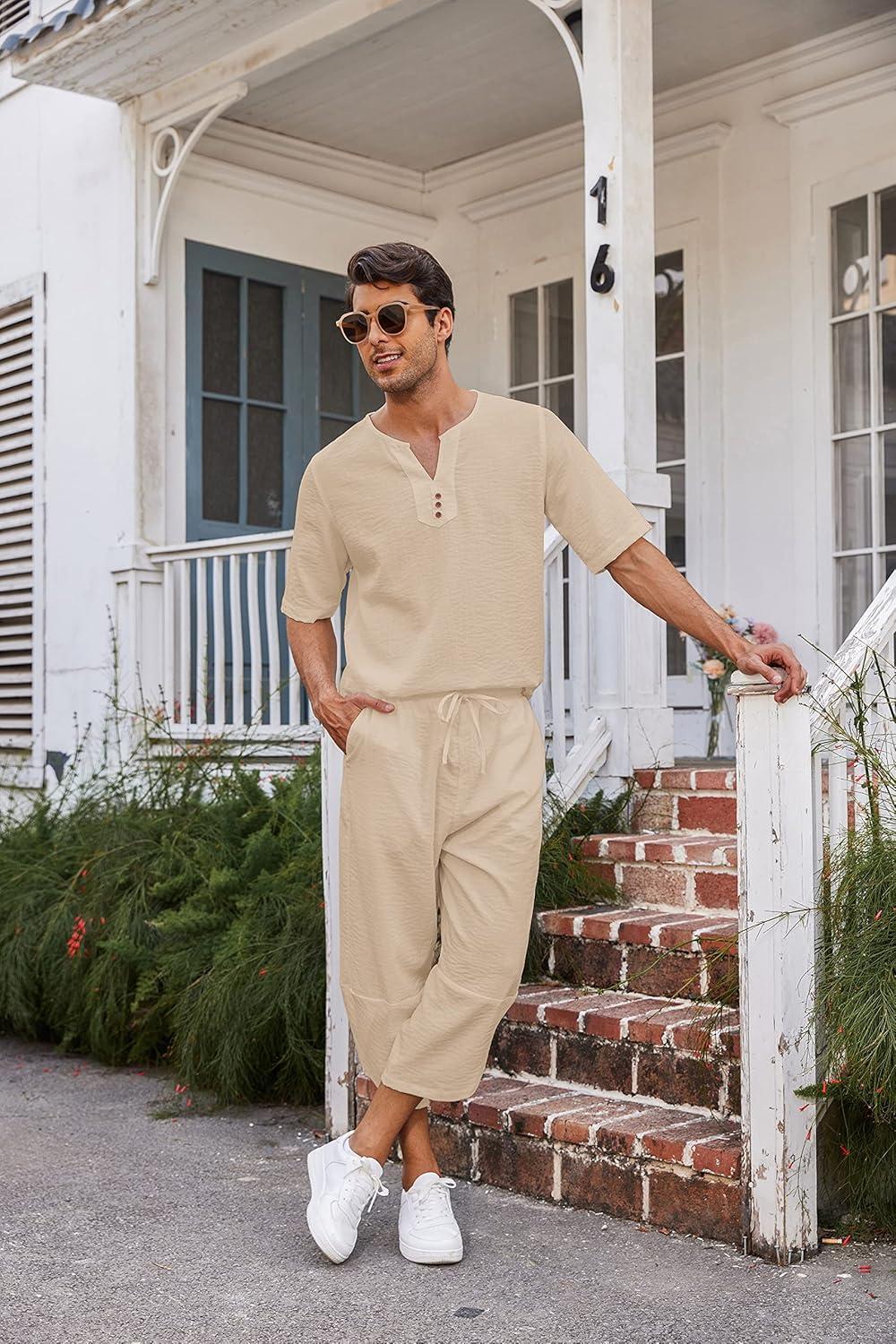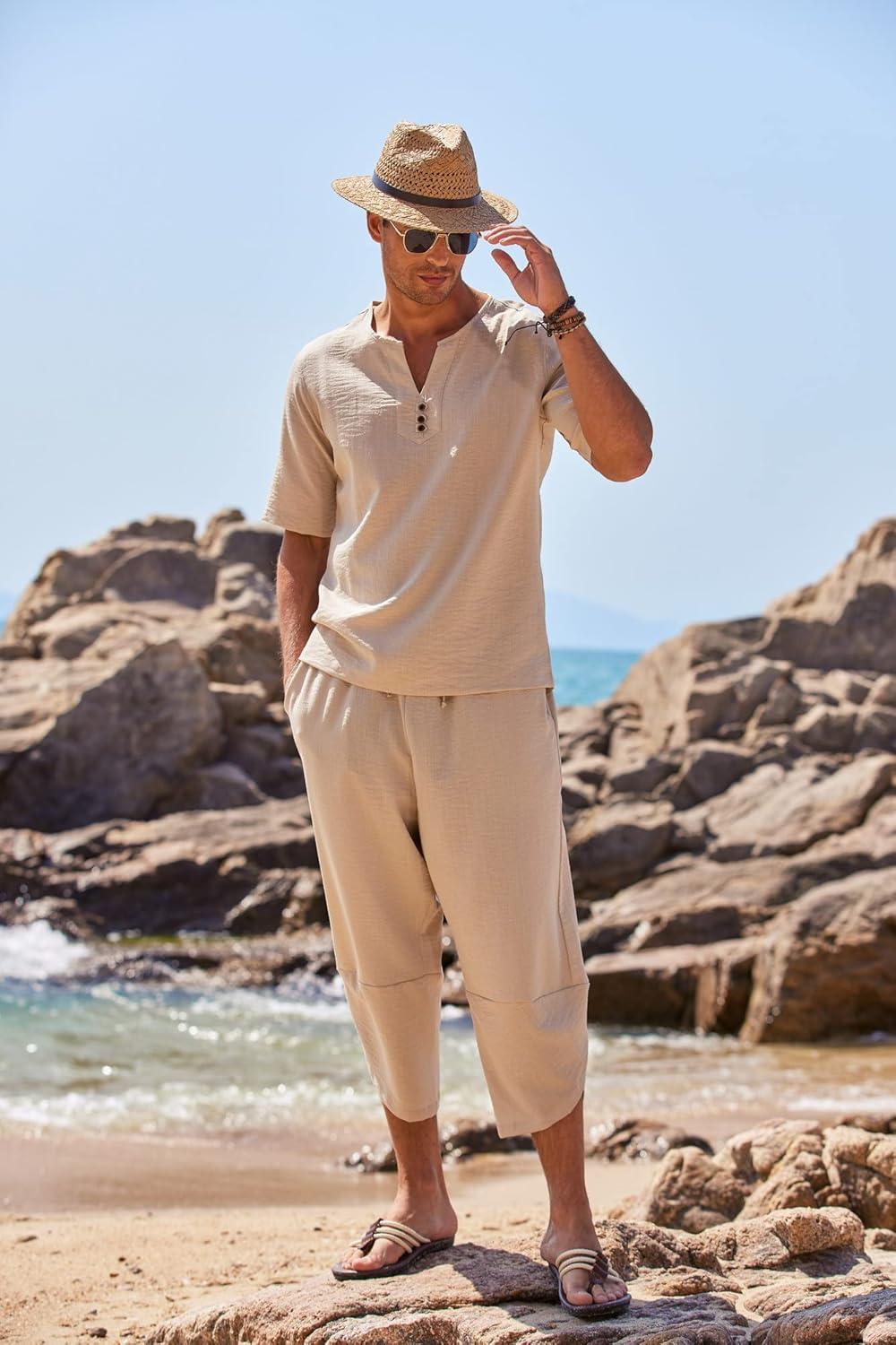 COOFANDY Men’s 2 Pieces Linen Set Henley Shirt Short Sleeve and Harem Capri Pants Wide Leg Baggy Beach Yoga Trousers Outfits(02-light Khaki)