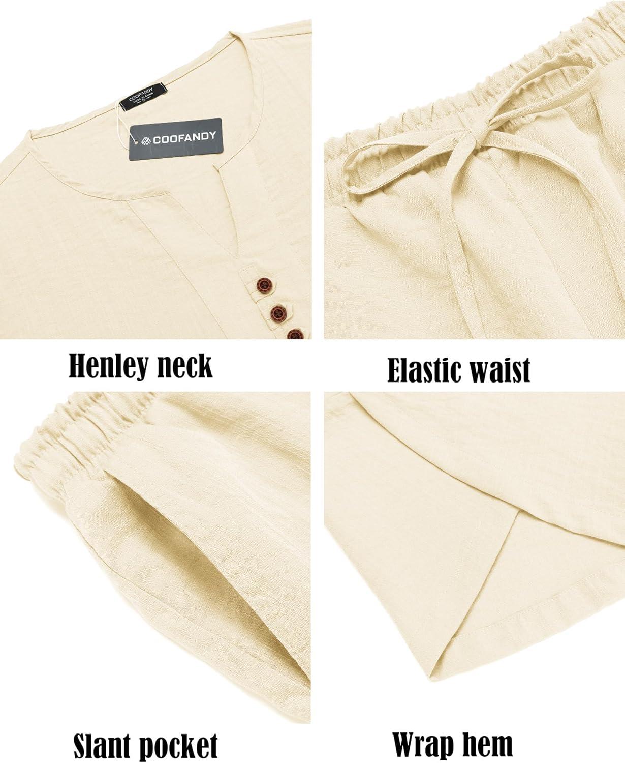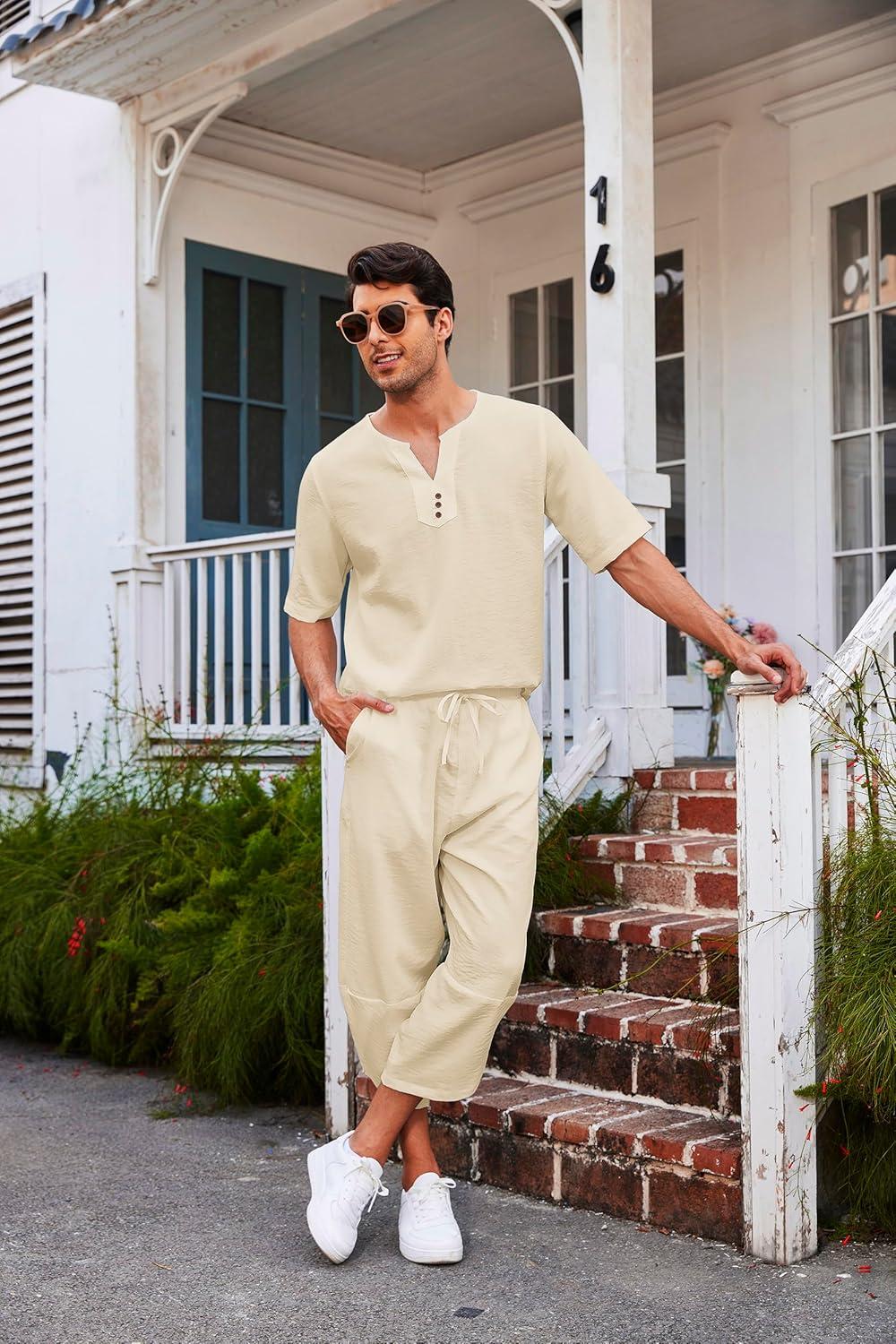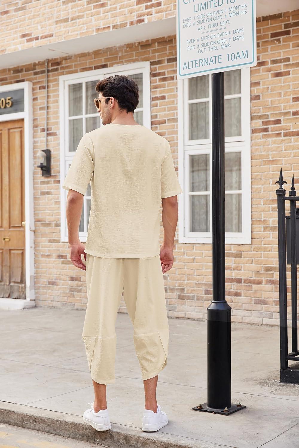 COOFANDY Men's 2 Pieces Linen Set Henley Shirt Short Sleeve and Harem Capri Pants Wide Leg Baggy Beach Yoga Trousers Outfits(Beige)