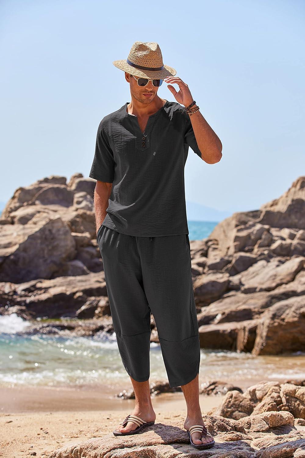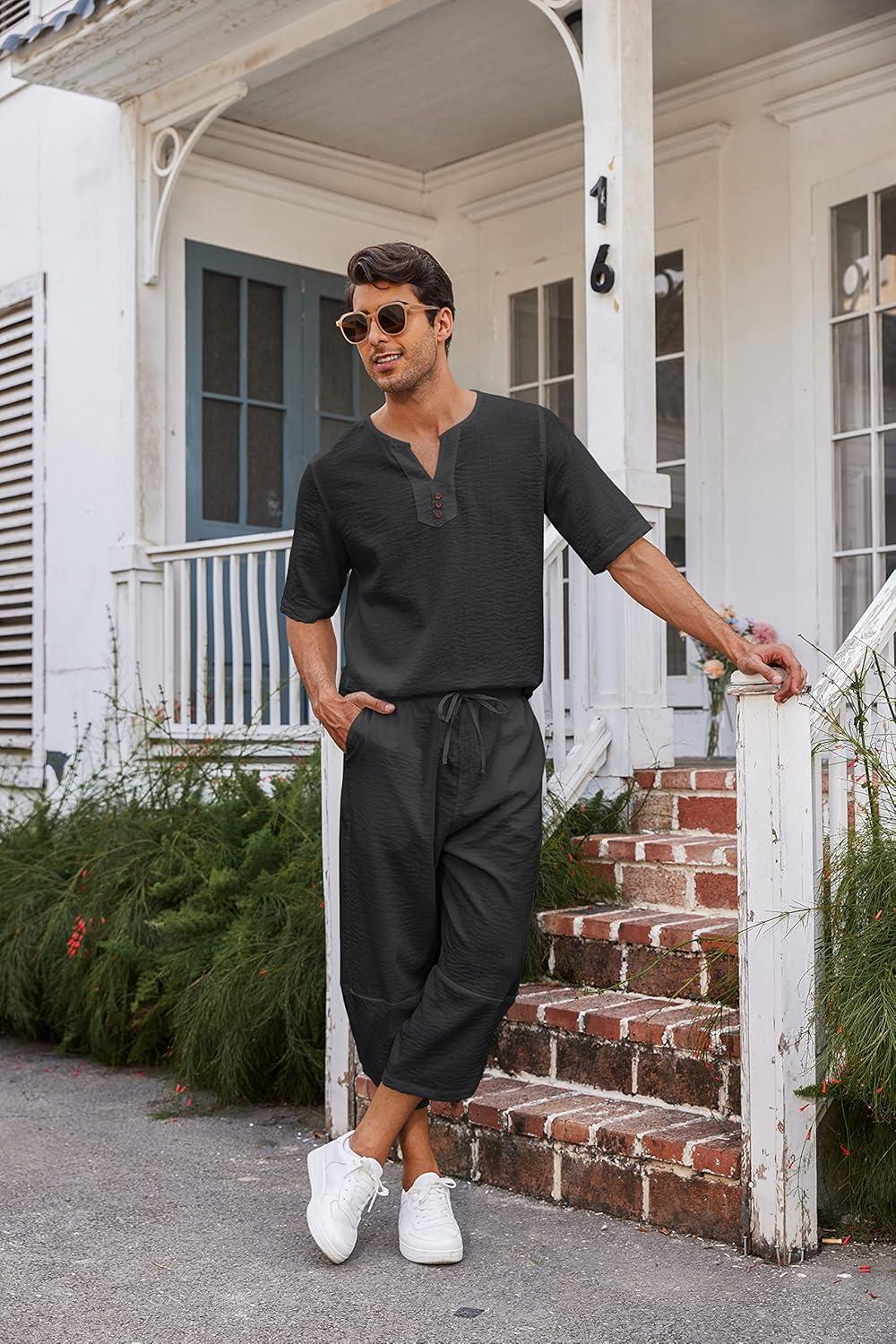COOFANDY Men's 2 Pieces Linen Set Henley Shirt Short Sleeve and Harem Capri Pants Wide Leg Baggy Beach Yoga Trousers Outfits(Black)