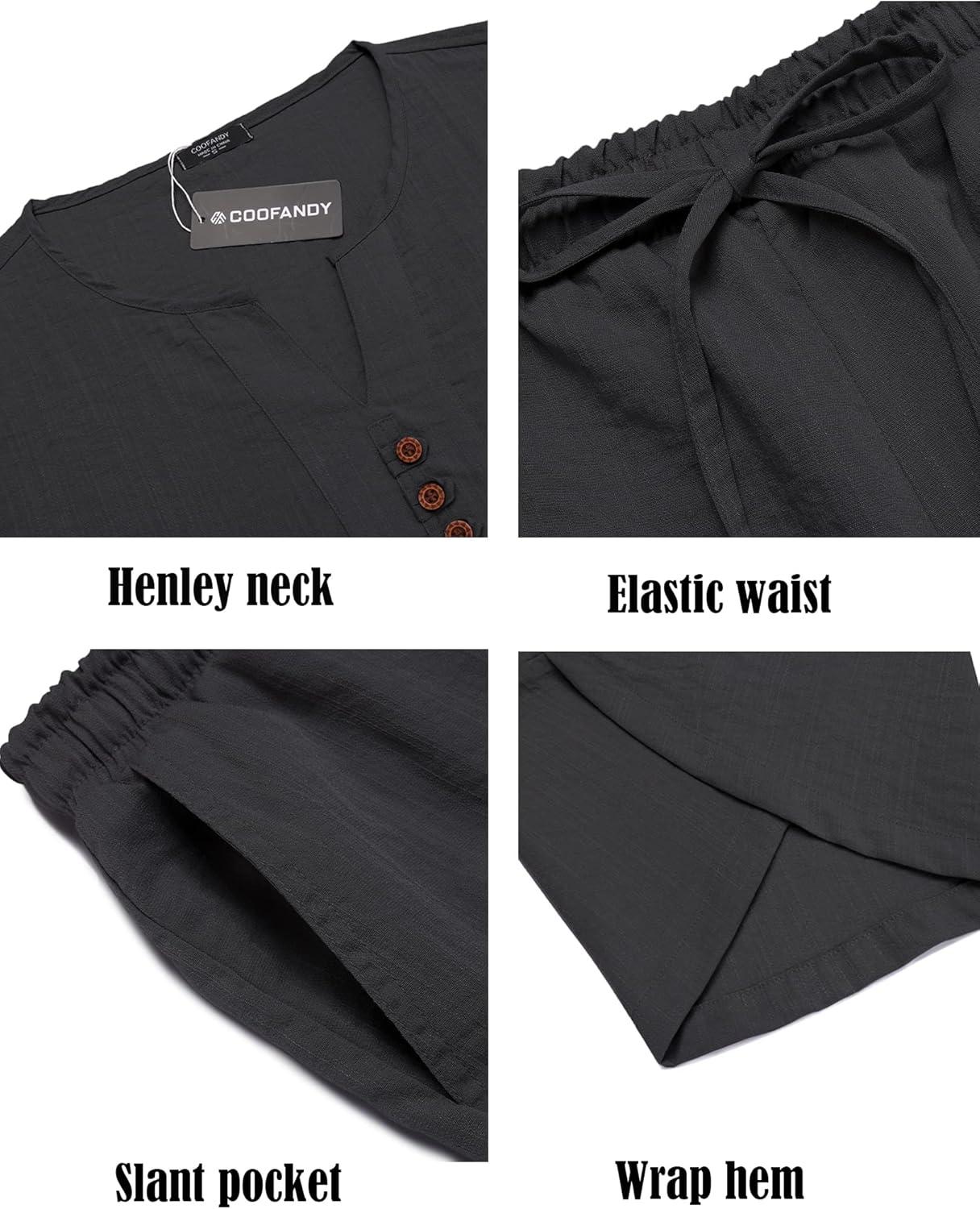 imageCOOFANDY Mens 2 Pieces Linen Set Henley Shirt Short Sleeve and Harem Capri Pants Wide Leg Baggy Beach Yoga Trousers OutfitsBlack