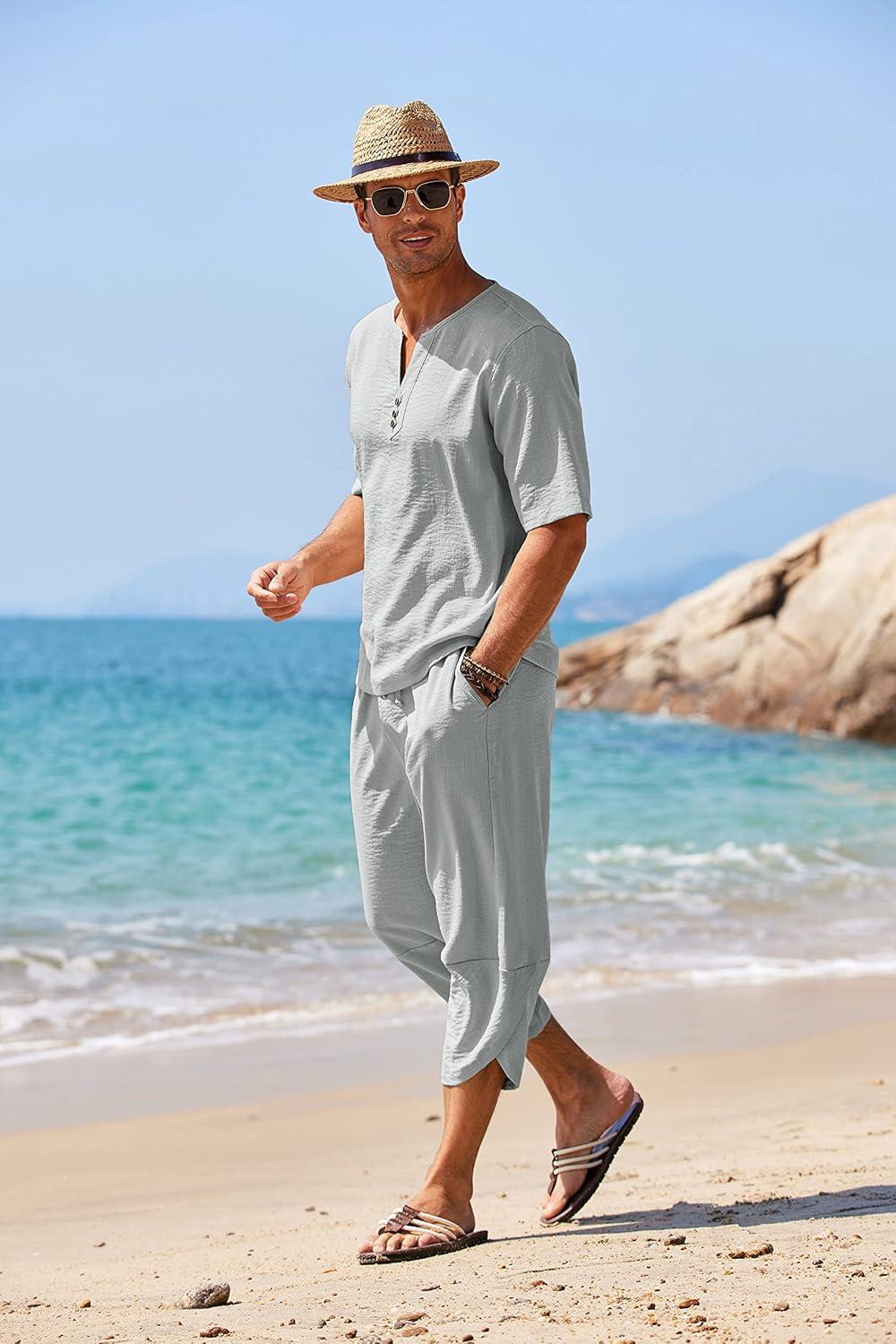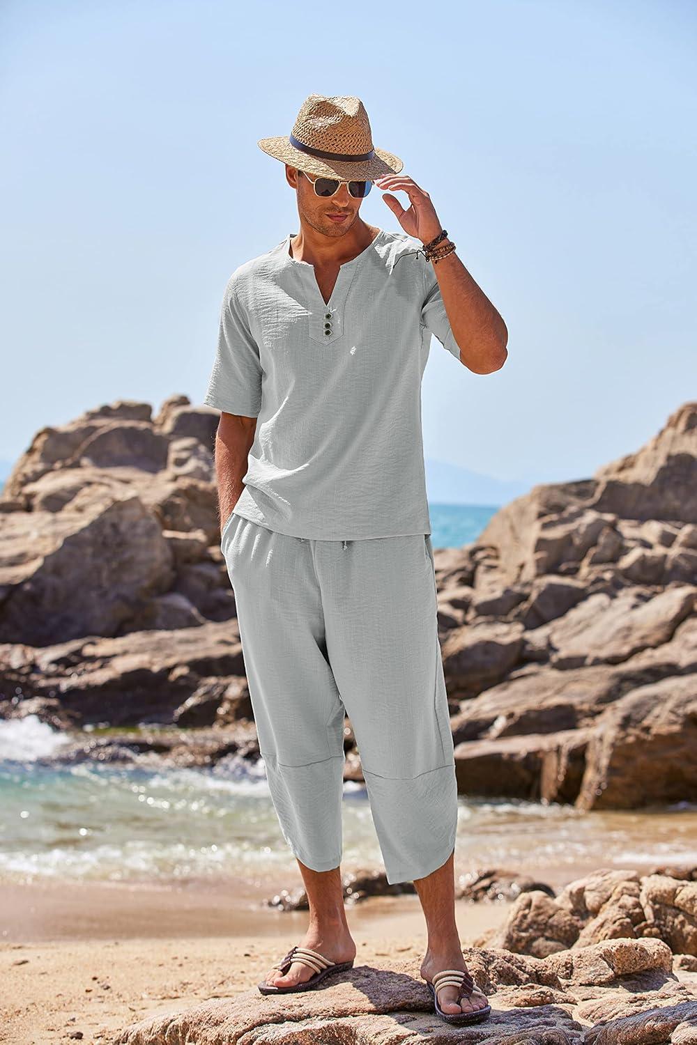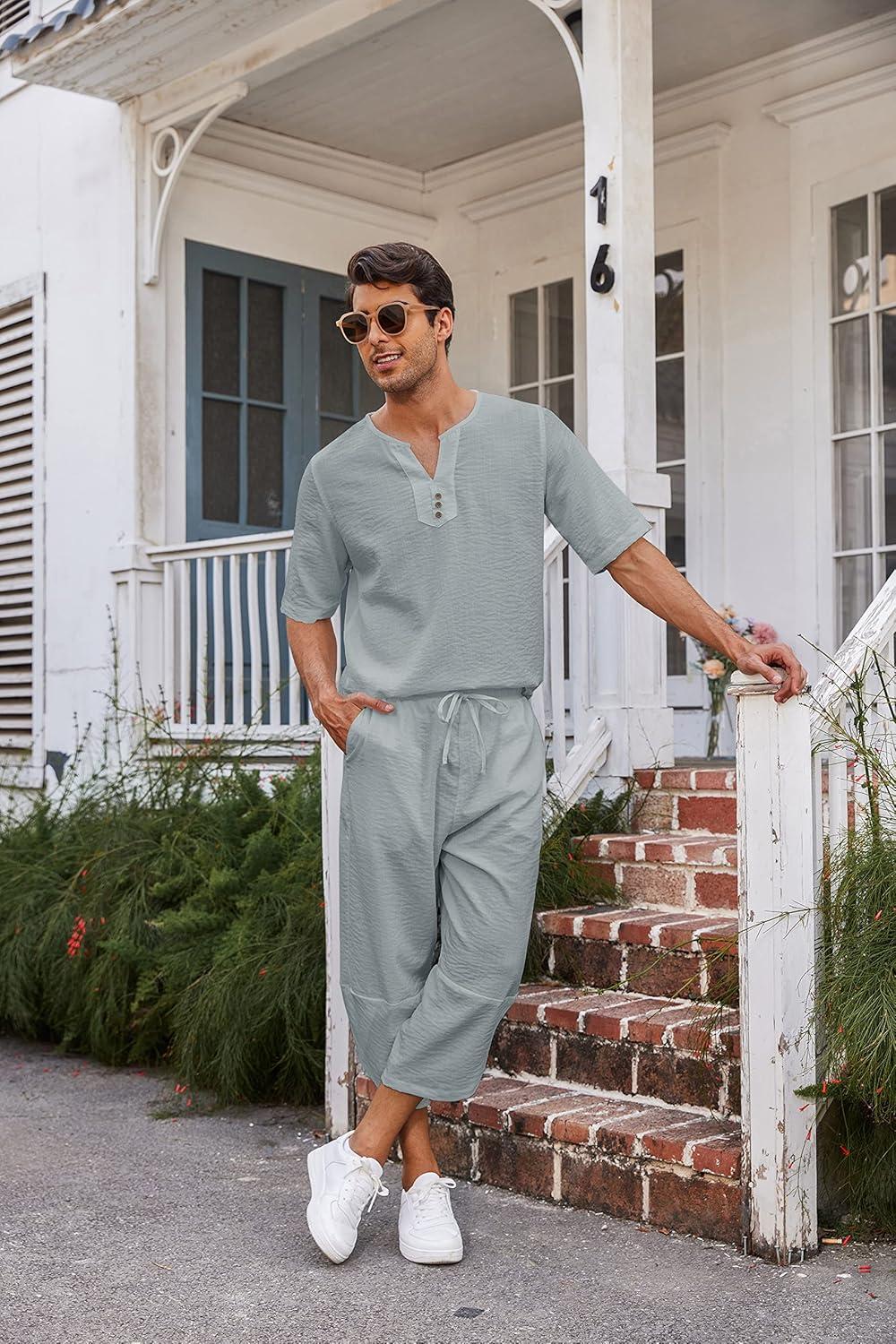 COOFANDY Men's 2 Pieces Linen Set Henley Shirt Short Sleeve and Harem Capri Pants Wide Leg Baggy Beach Yoga Trousers Outfits(Grey)