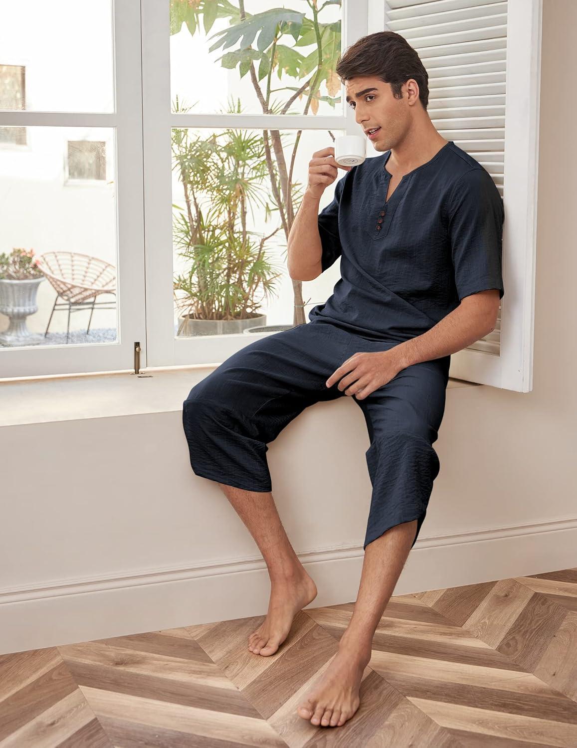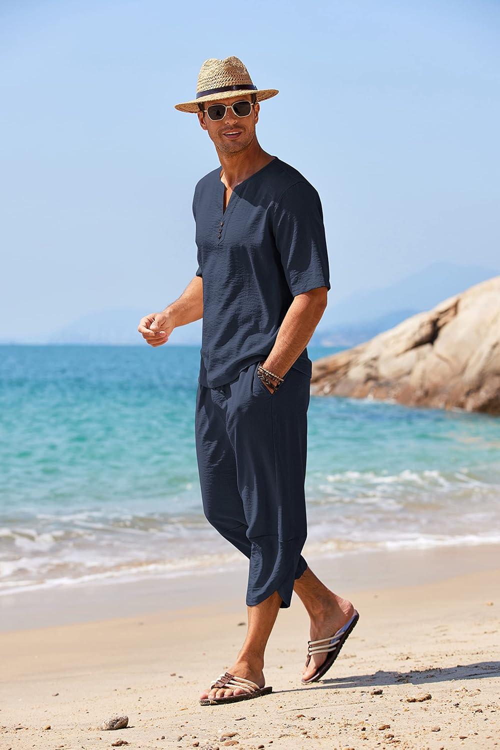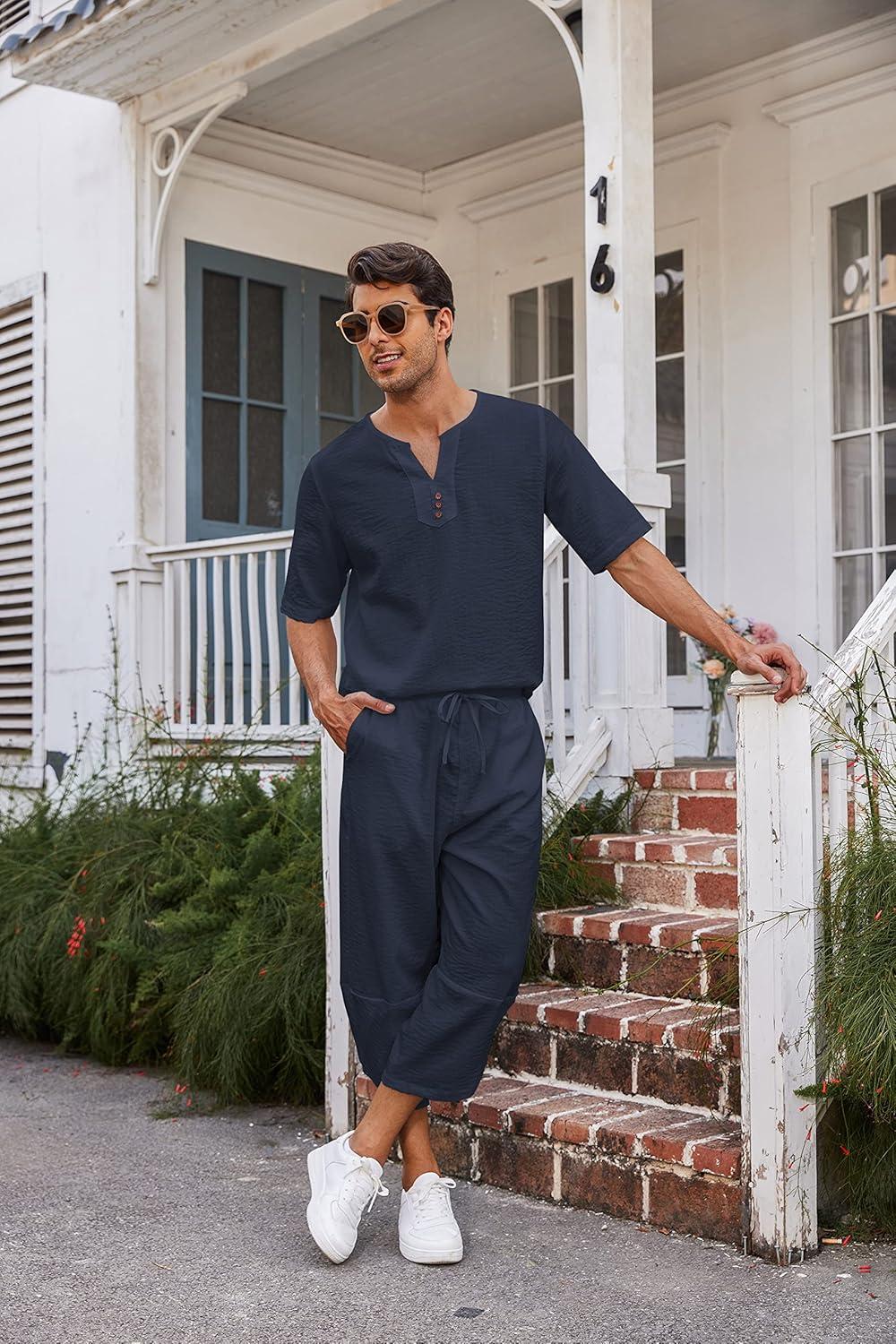 COOFANDY Men’s 2 Pieces Linen Set Henley Shirt Short Sleeve and Harem Capri Pants Wide Leg Baggy Beach Yoga Trousers Outfits(Navy Blue)