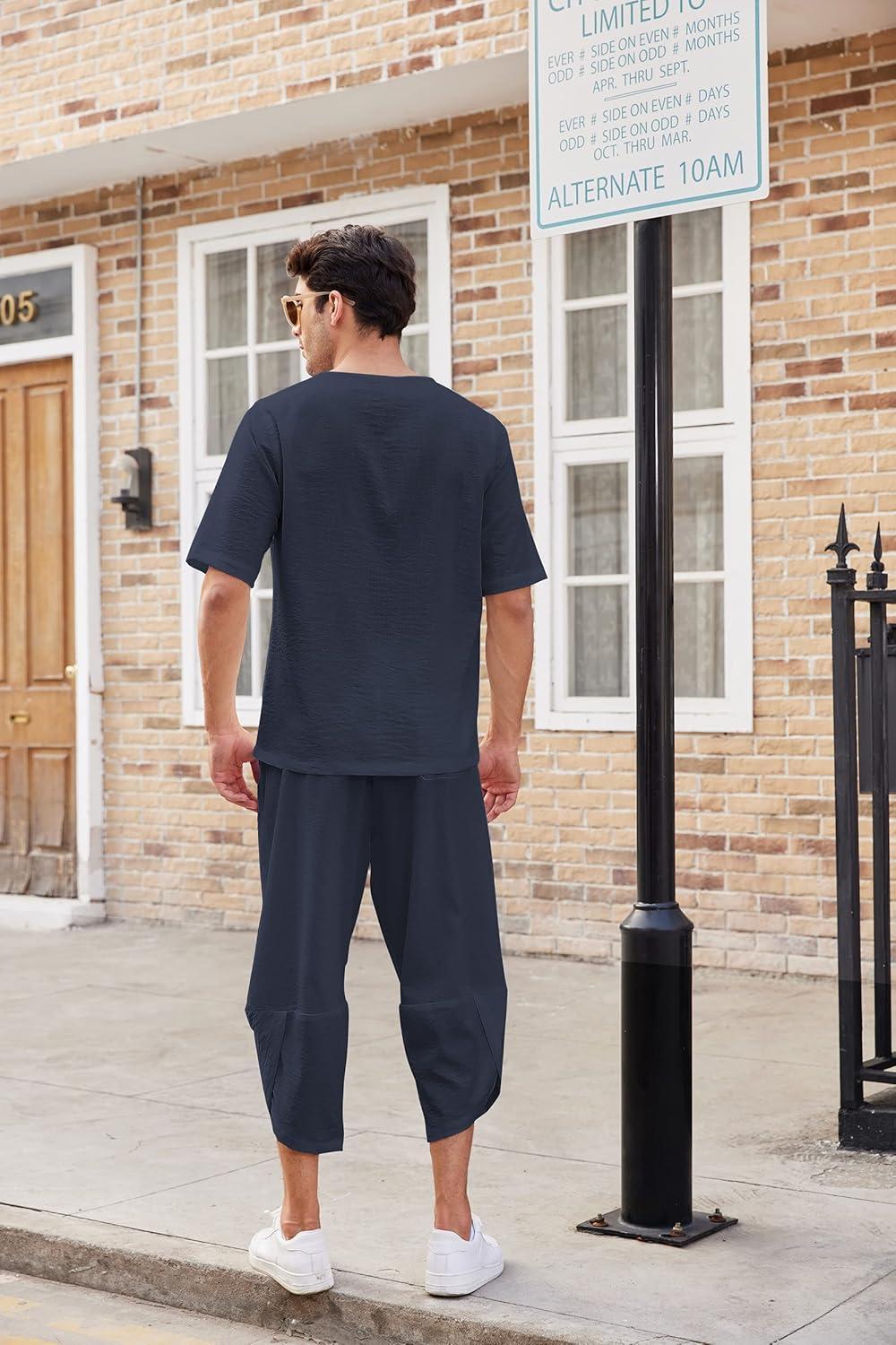 COOFANDY Men's 2 Pieces Linen Set Henley Shirt Short Sleeve and Harem Capri Pants Wide Leg Baggy Beach Yoga Trousers Outfits(Navy Blue)