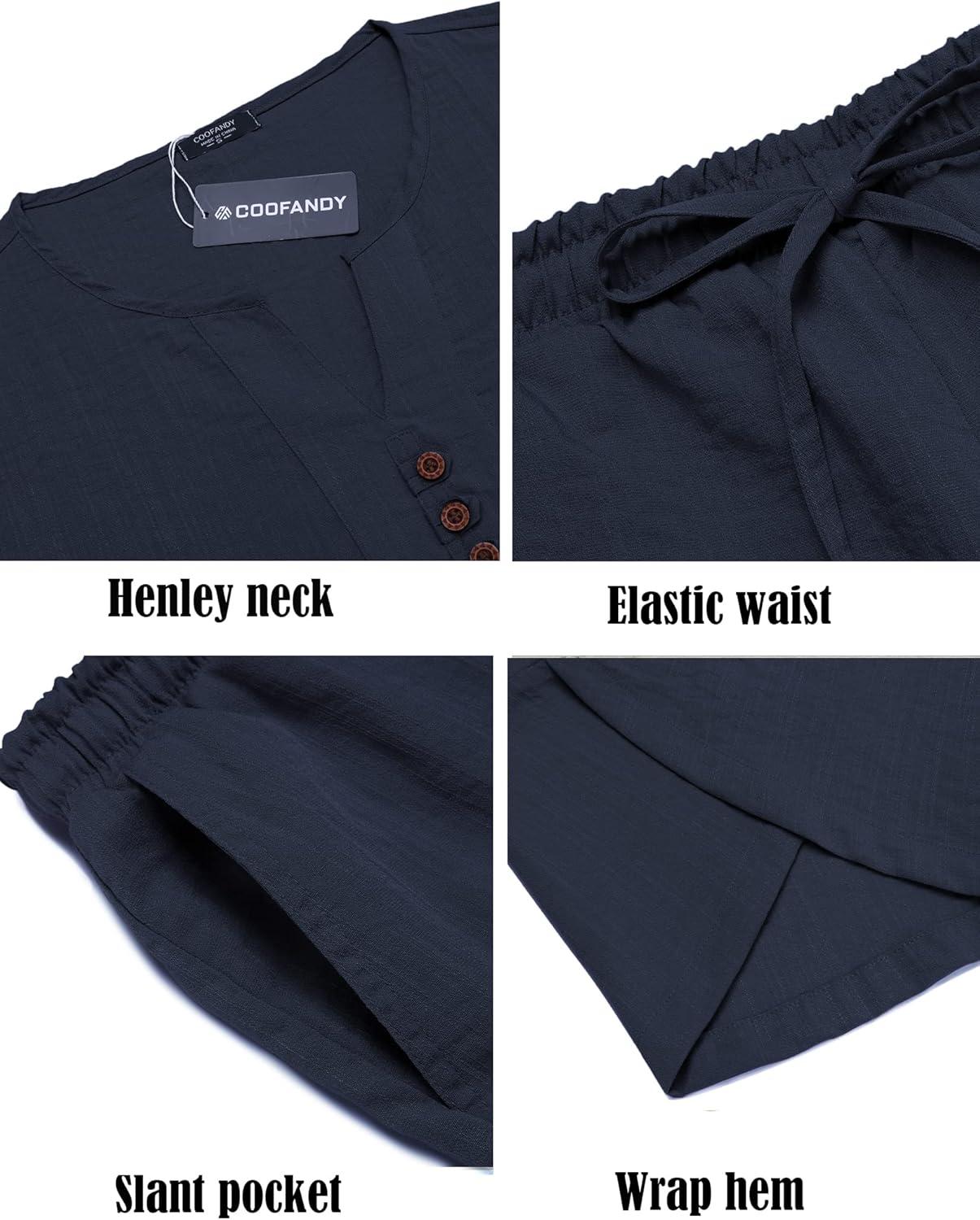 imageCOOFANDY Mens 2 Pieces Linen Set Henley Shirt Short Sleeve and Harem Capri Pants Wide Leg Baggy Beach Yoga Trousers OutfitsNavy Blue