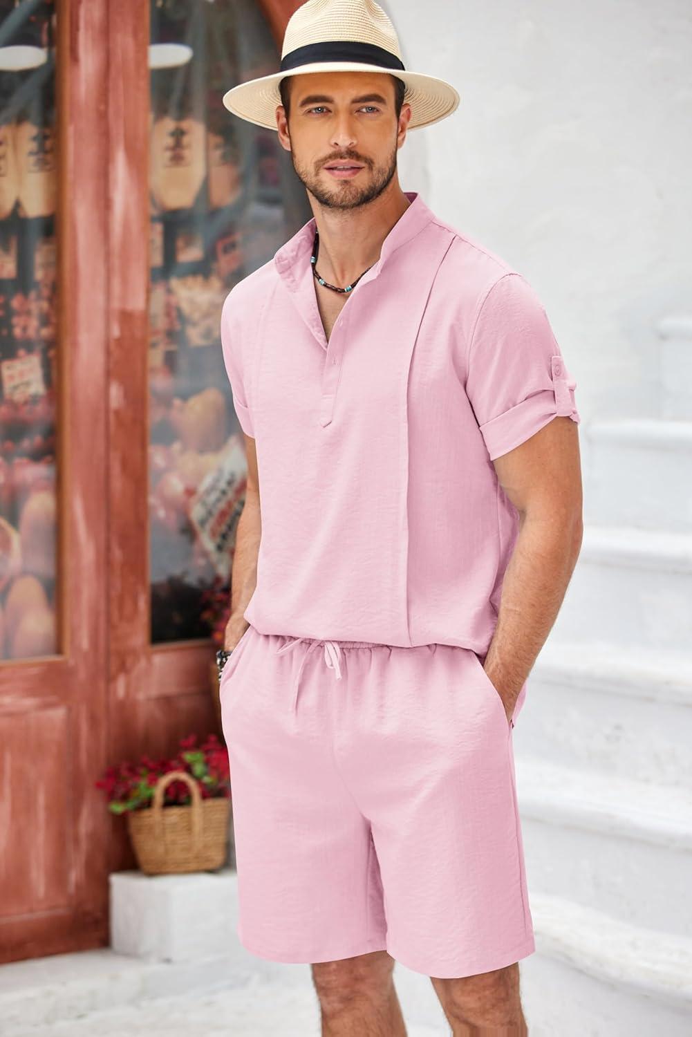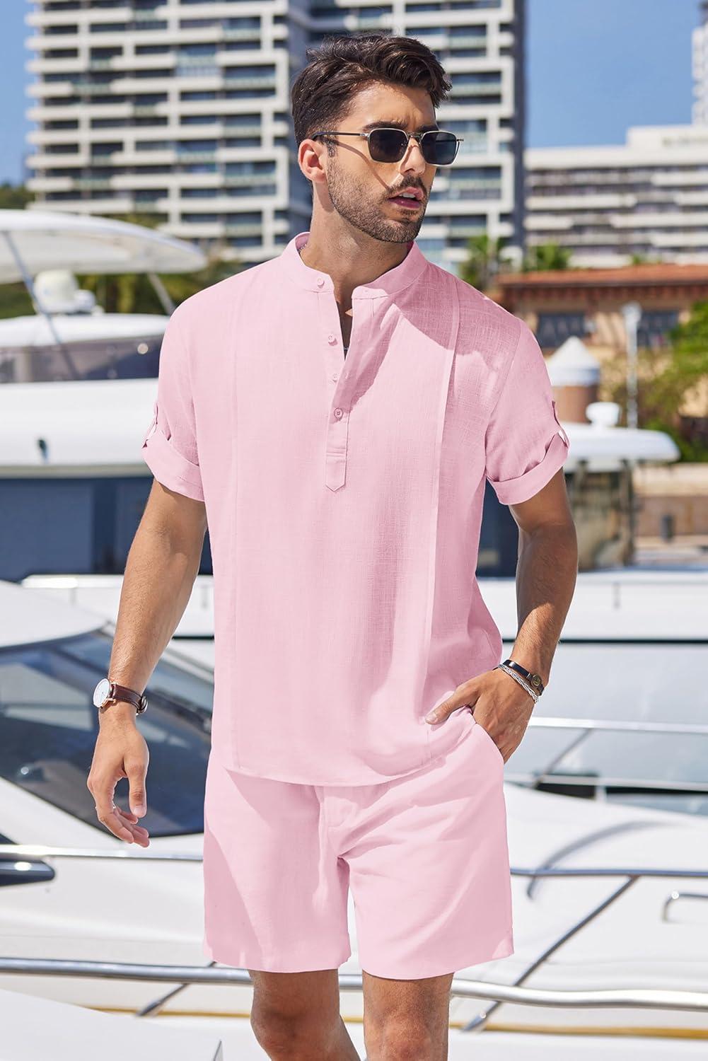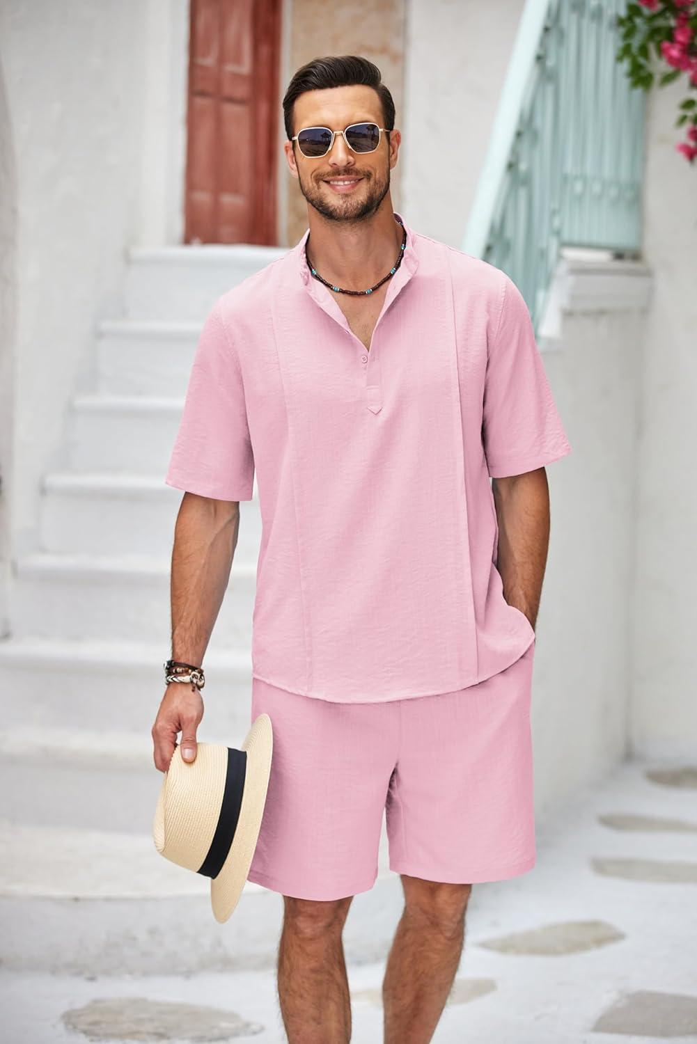 COOFANDY Men’s 2 Pieces Linen Set Henley Shirt Short Sleeve and Shorts Summer Beach Yoga Matching Outfits(Pink)