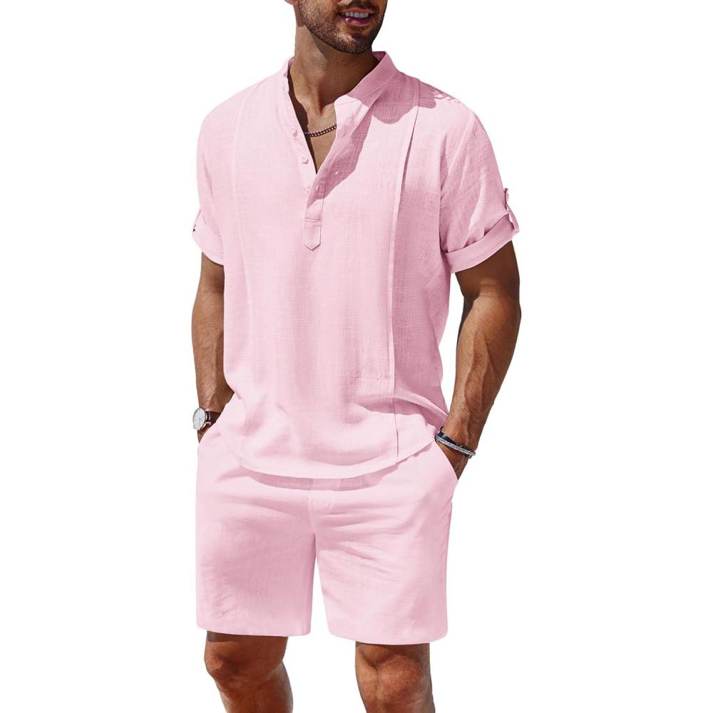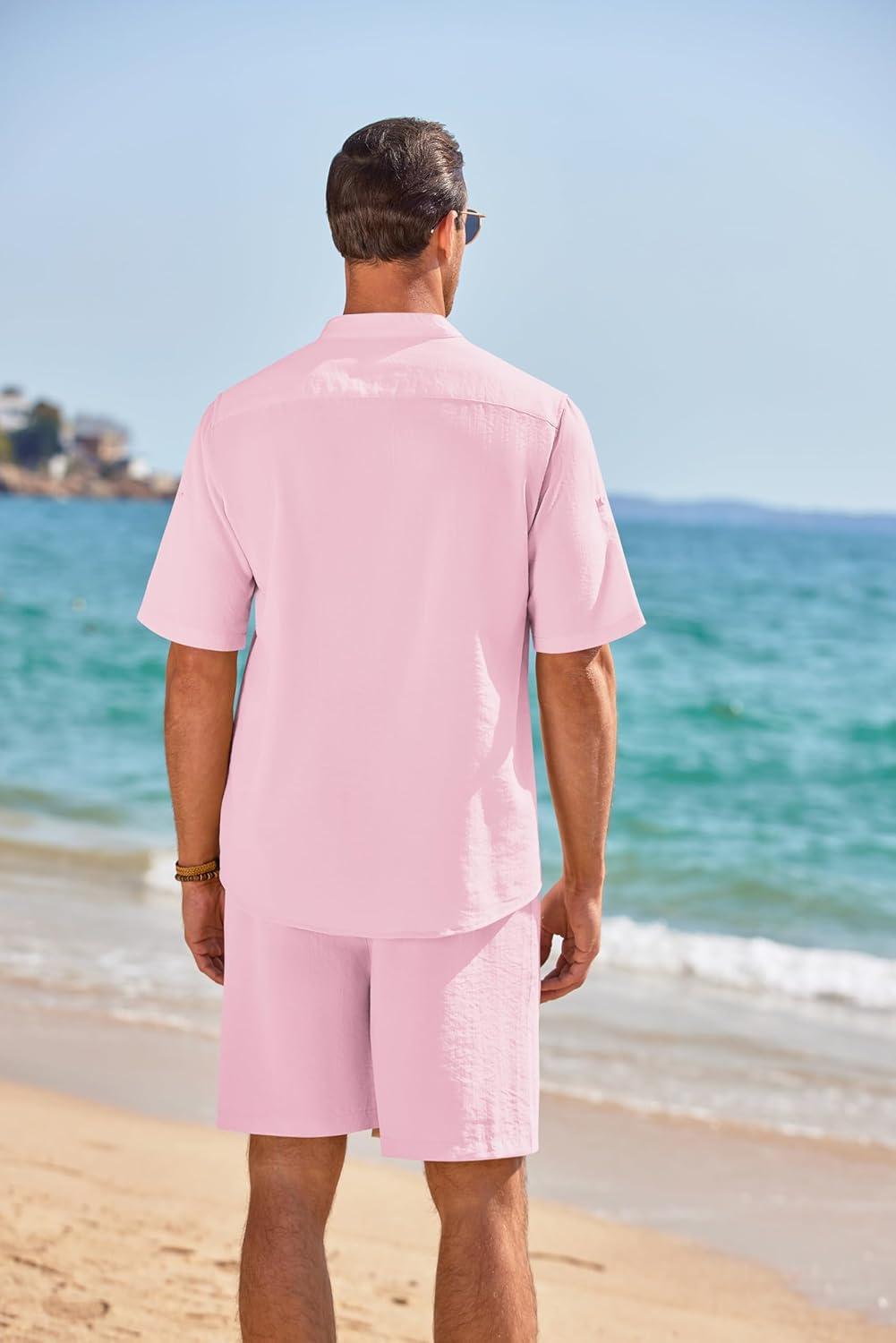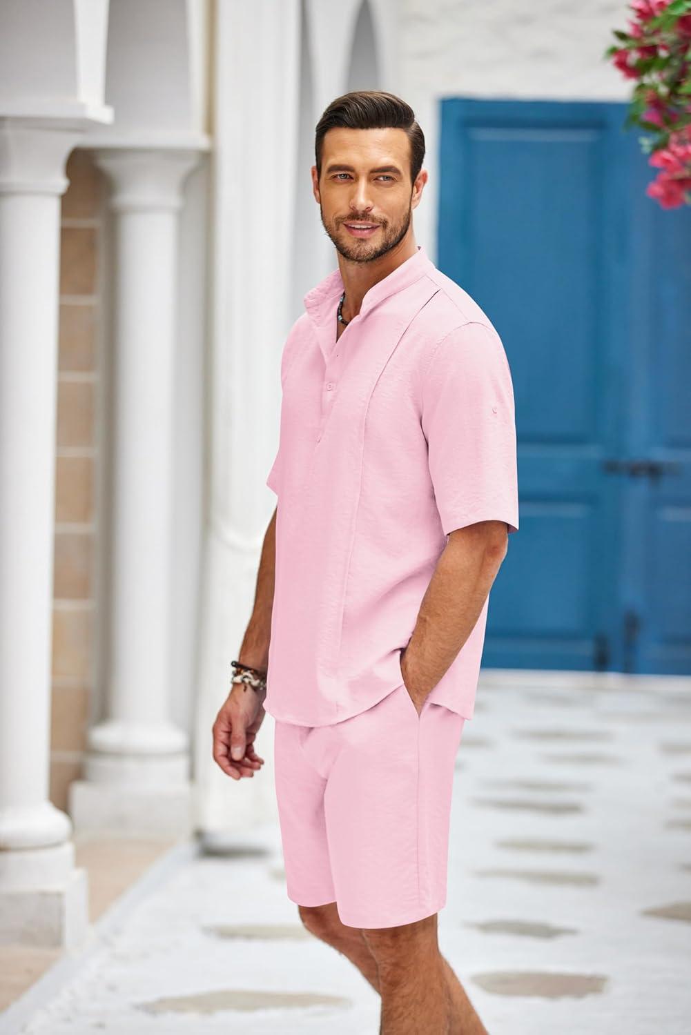 COOFANDY Men’s 2 Pieces Linen Set Henley Shirt Short Sleeve and Shorts Summer Beach Yoga Matching Outfits(Pink)