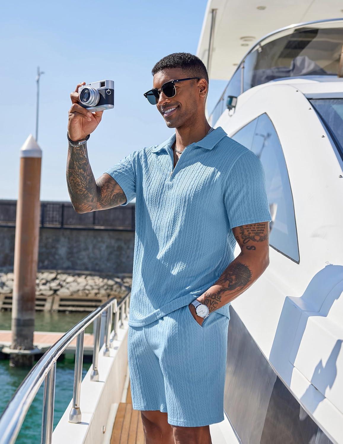 COOFANDY Men’s 2 Pieces Outfits Casual Quarter Zip Polo Shirt and Shorts Set Athletic Jogging Summer Tracksuit(Light Blue)
