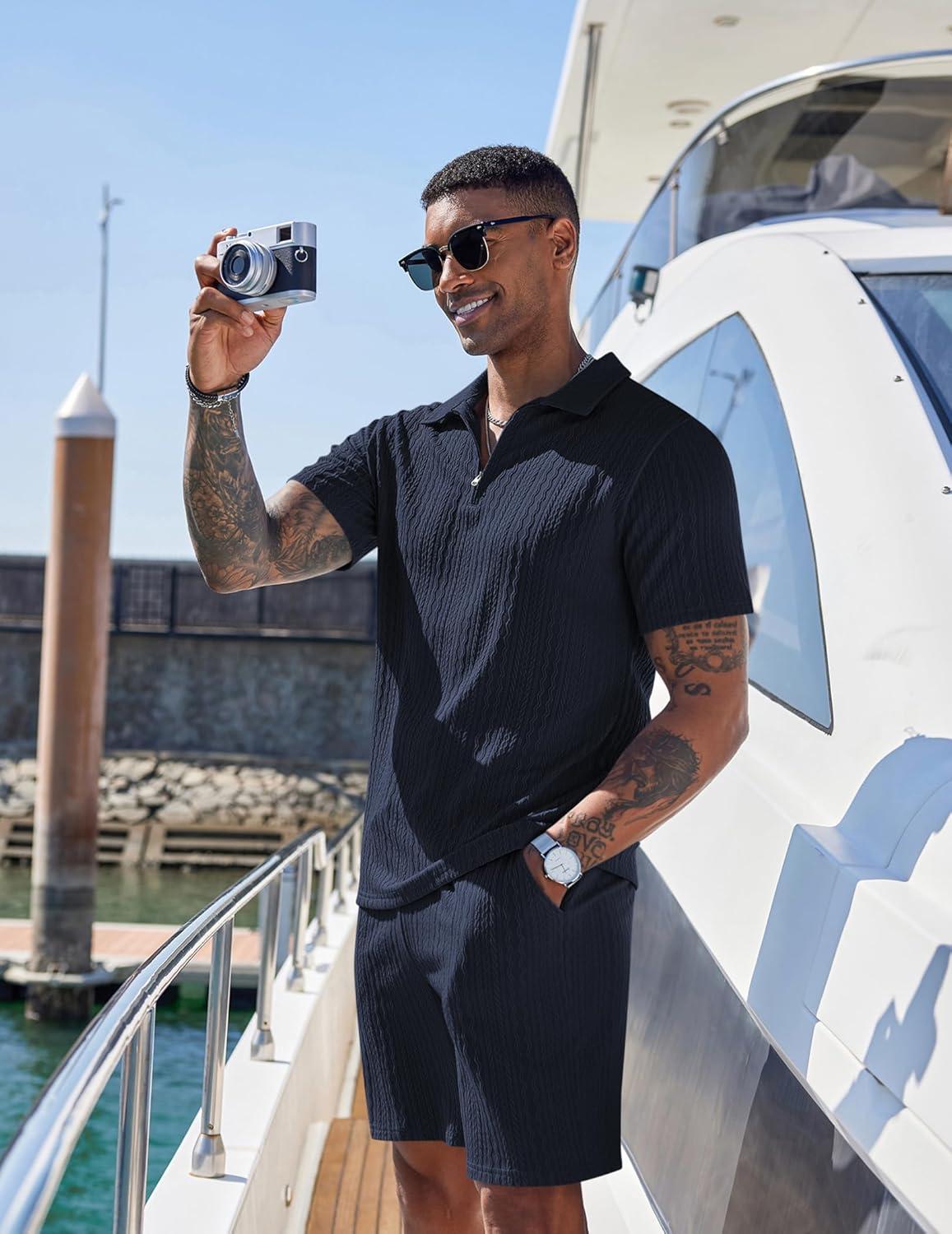 COOFANDY Men’s 2 Pieces Outfits Casual Quarter Zip Polo Shirt and Shorts Set Athletic Jogging Summer Tracksuit(1-black)