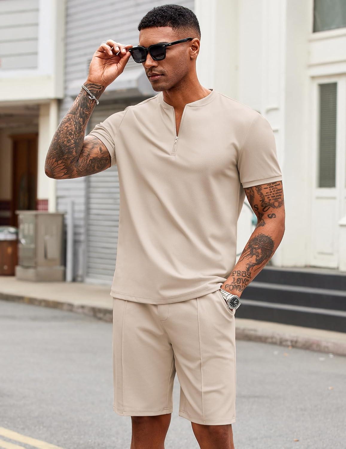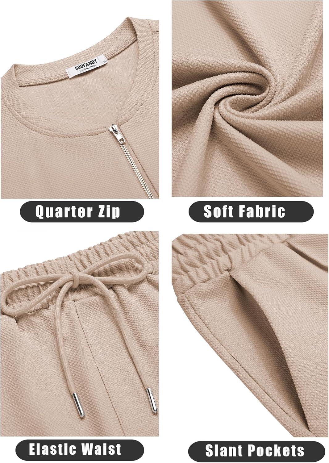 COOFANDY Men’s 2 Pieces Outfits Casual Quarter Zip Polo T Shirt and Shorts Set Athletic Jogging Summer Tracksuit(Champagne)