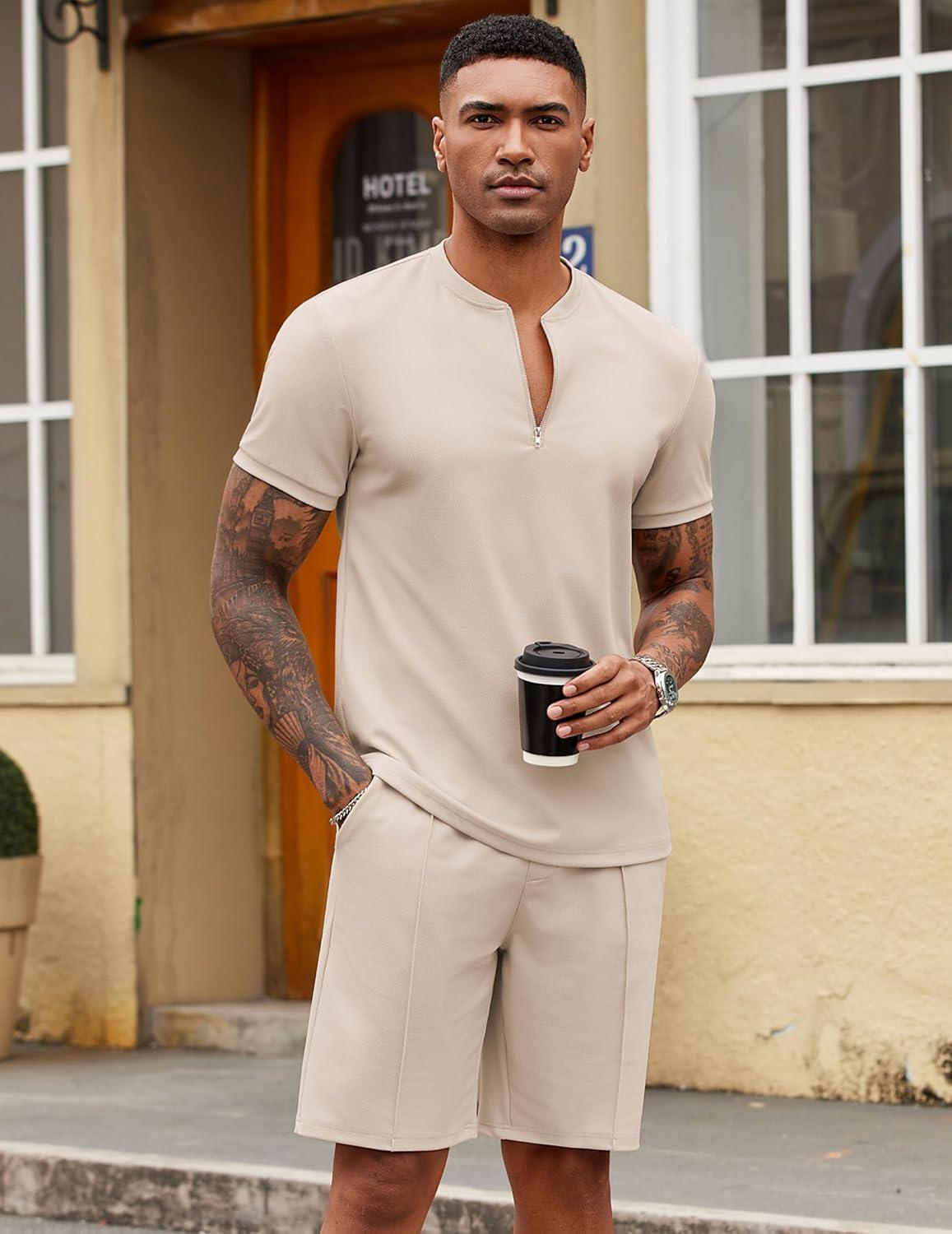 COOFANDY Men's 2 Pieces Outfits Casual Quarter Zip Polo T Shirt and Shorts Set Athletic Jogging Summer Tracksuit(Champagne)