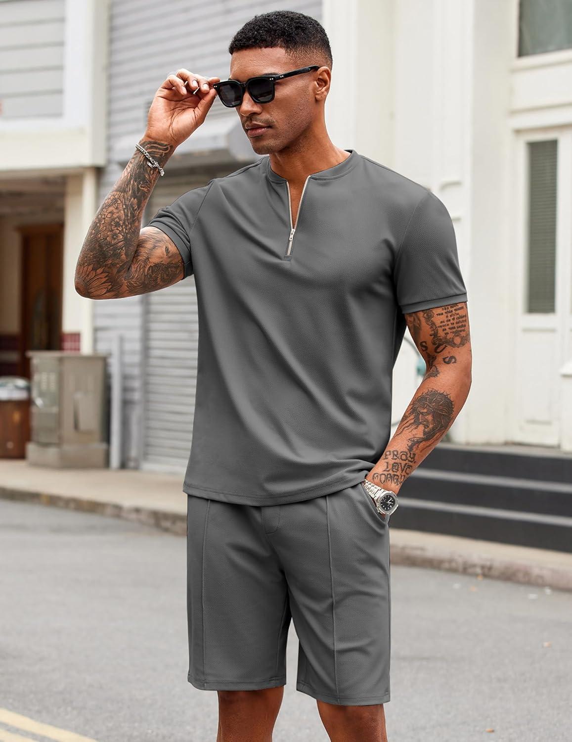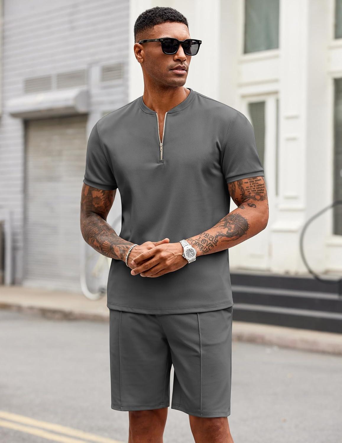 COOFANDY Men's 2 Pieces Outfits Casual Quarter Zip Polo T Shirt and Shorts Set Athletic Jogging Summer Tracksuit(Dark Grey)
