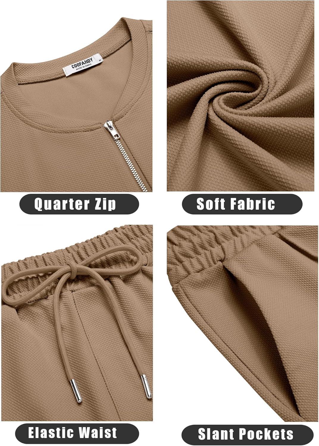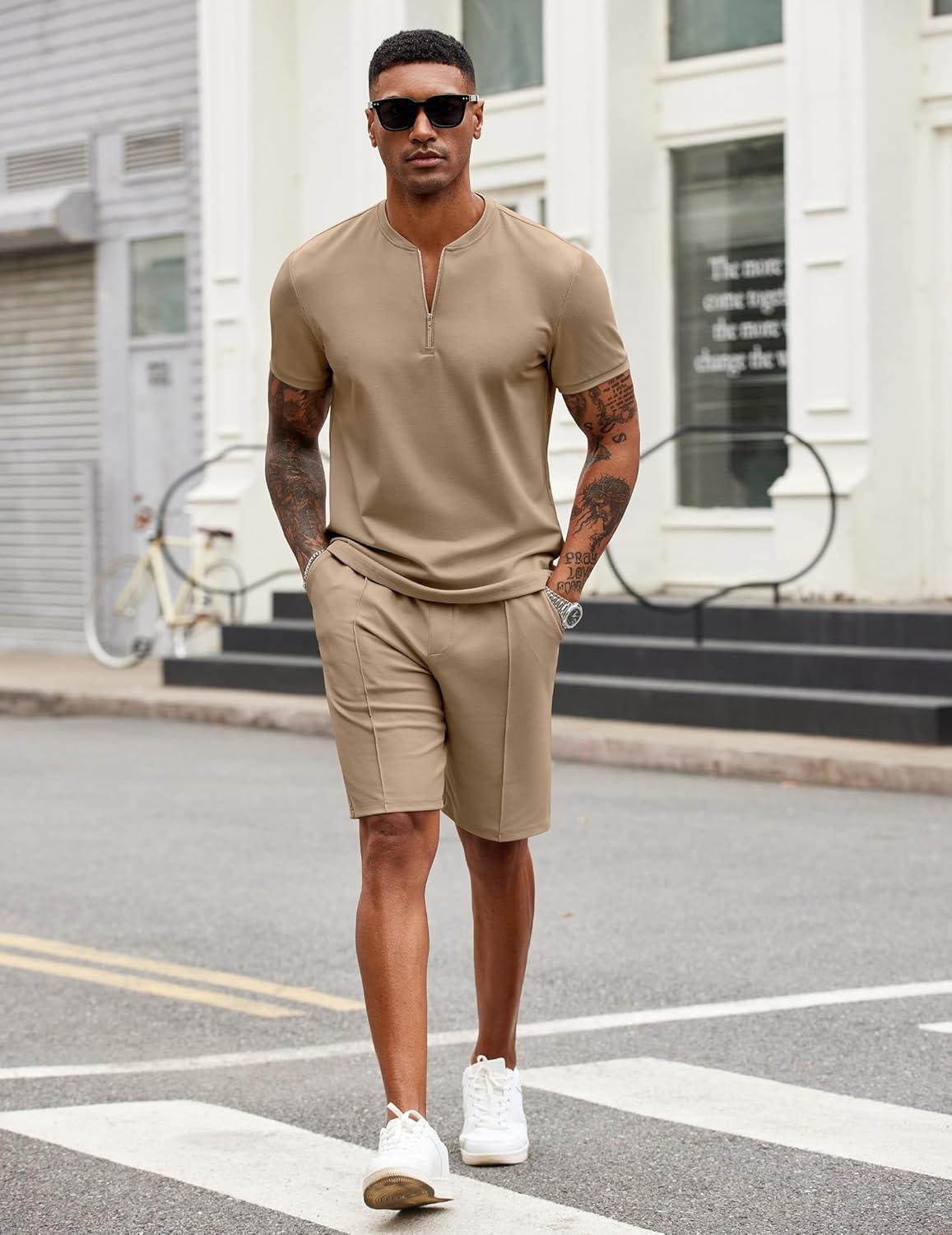 COOFANDY Men’s 2 Pieces Outfits Casual Quarter Zip Polo T Shirt and Shorts Set Athletic Jogging Summer Tracksuit(Khaki)