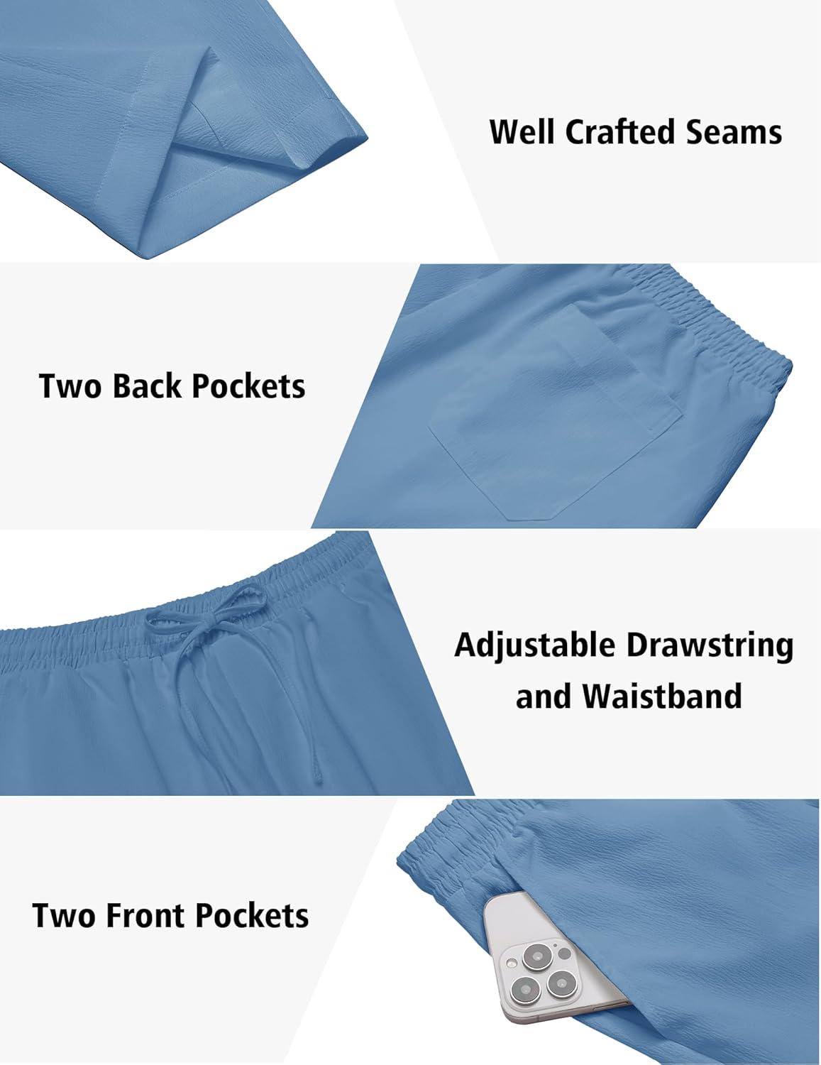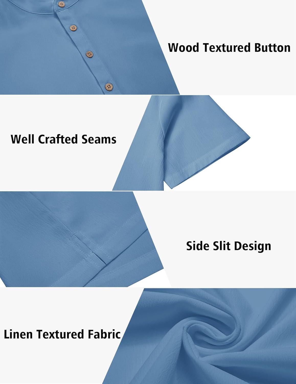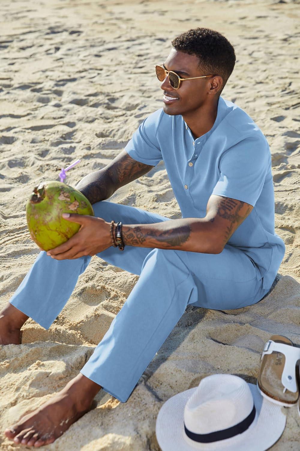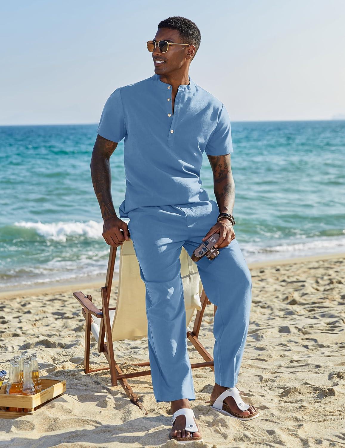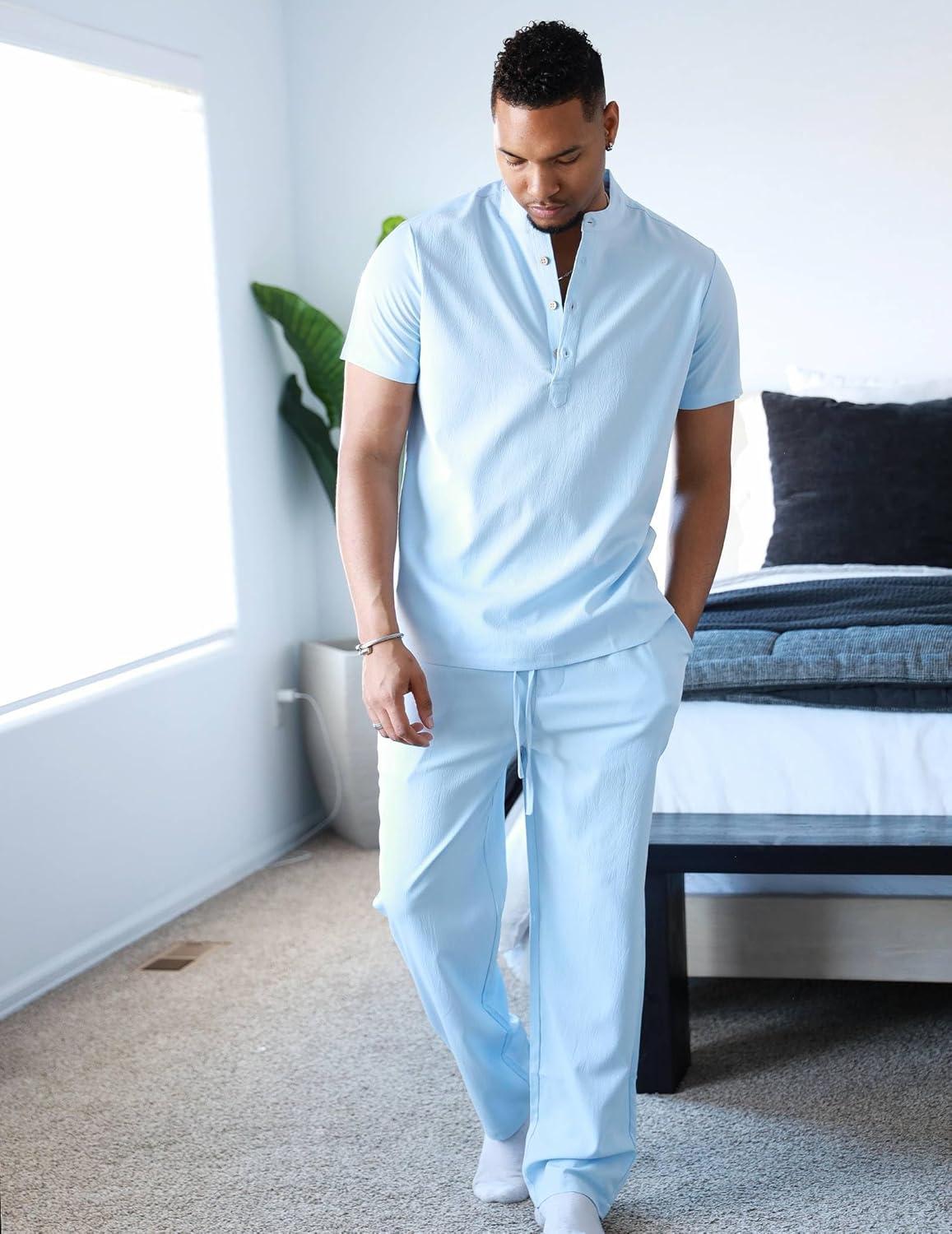 COOFANDY Men's 2 Pieces Set Short Sleeve Casual Henley Shirts Beach Yoga Pants Summer Beach Outfit(Blue)