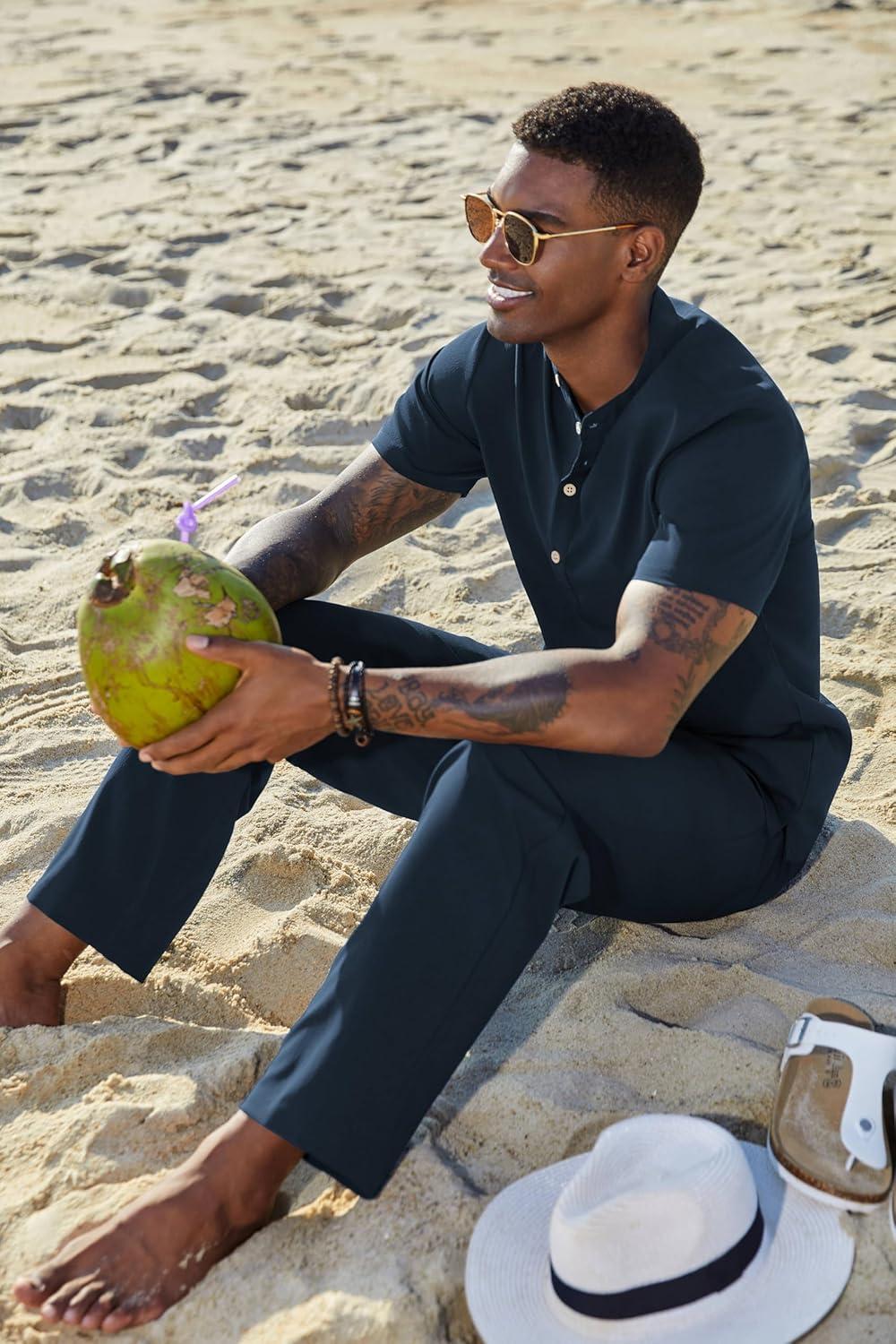 COOFANDY Men's 2 Pieces Set Short Sleeve Casual Henley Shirts Beach Yoga Pants Summer Beach Outfit(Navy Blue)