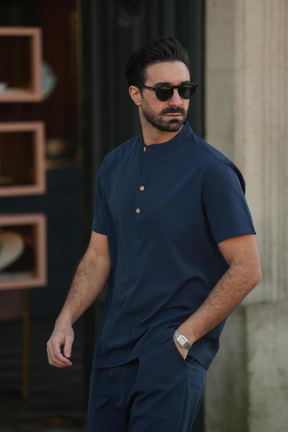 COOFANDY Men’s 2 Pieces Set Short Sleeve Casual Henley Shirts Beach Yoga Pants Summer Beach Outfit(Navy Blue)