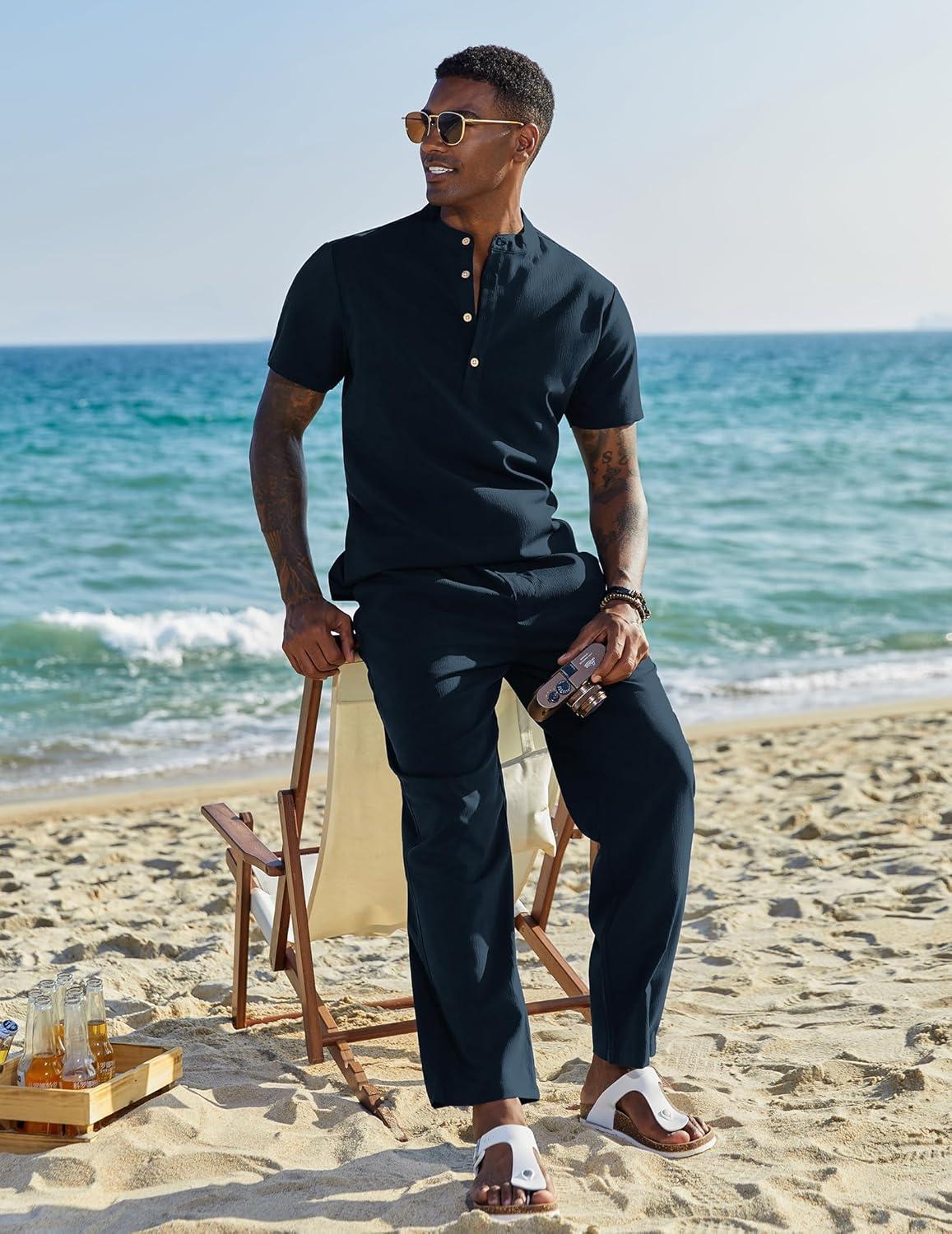 COOFANDY Men’s 2 Pieces Set Short Sleeve Casual Henley Shirts Beach Yoga Pants Summer Beach Outfit(Black)
