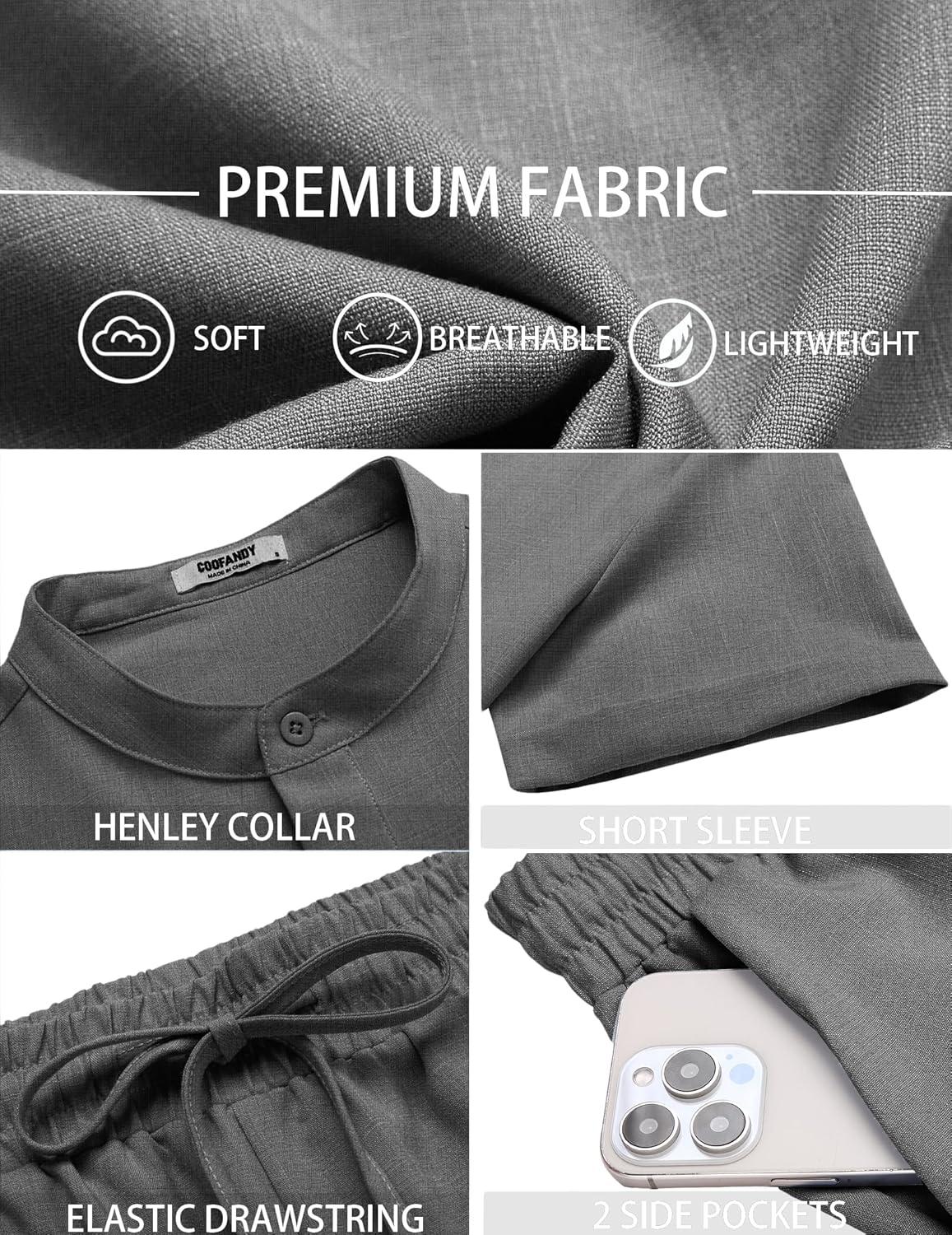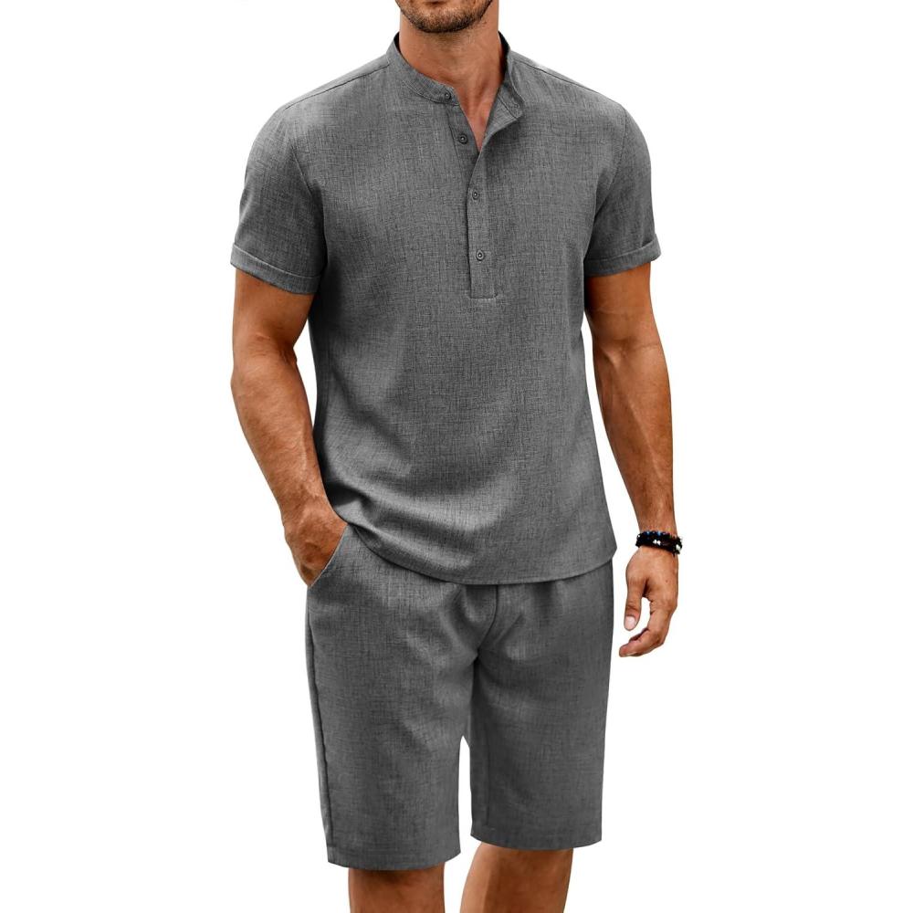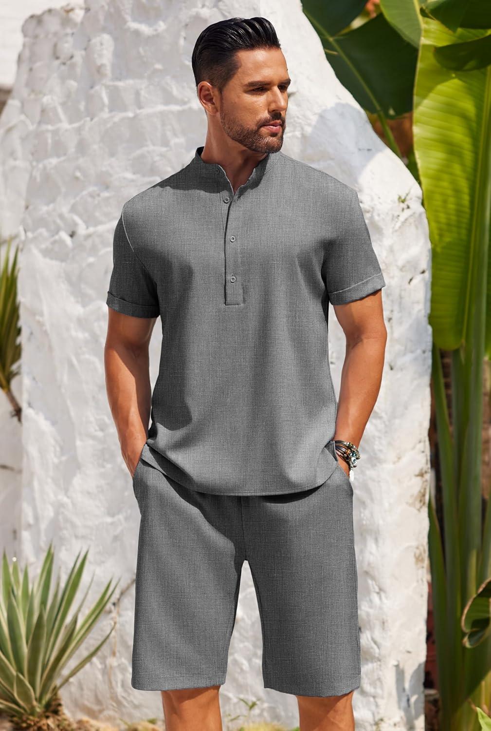 COOFANDY Men's 2 Pieces Set Short Sleeve Henley Shirts and Shorts Pants Texture Summer Beach Vacation Outfits(Dark Gray)