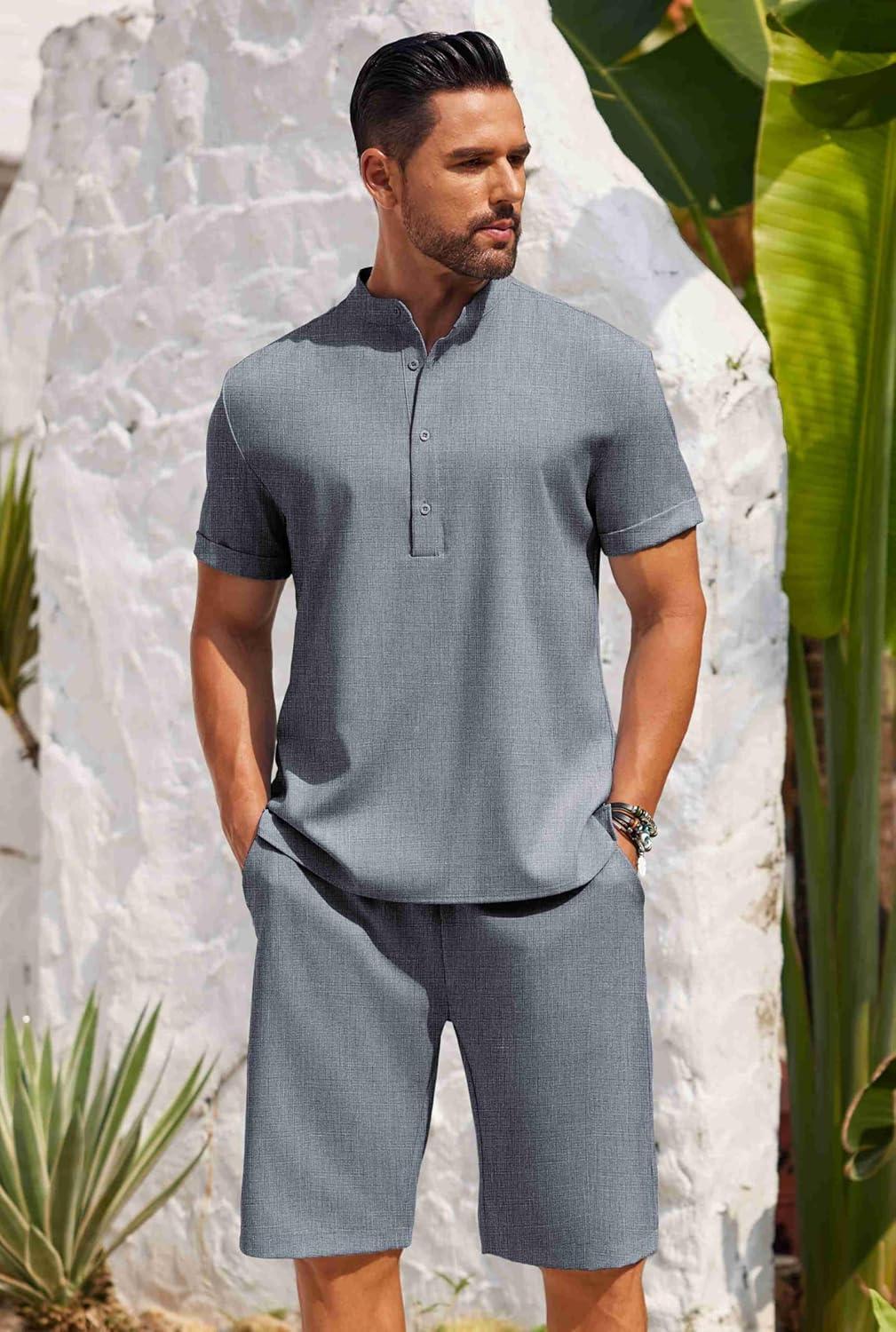 COOFANDY Men’s 2 Pieces Set Short Sleeve Henley Shirts and Shorts Pants Texture Summer Beach Vacation Outfits(Army Green)