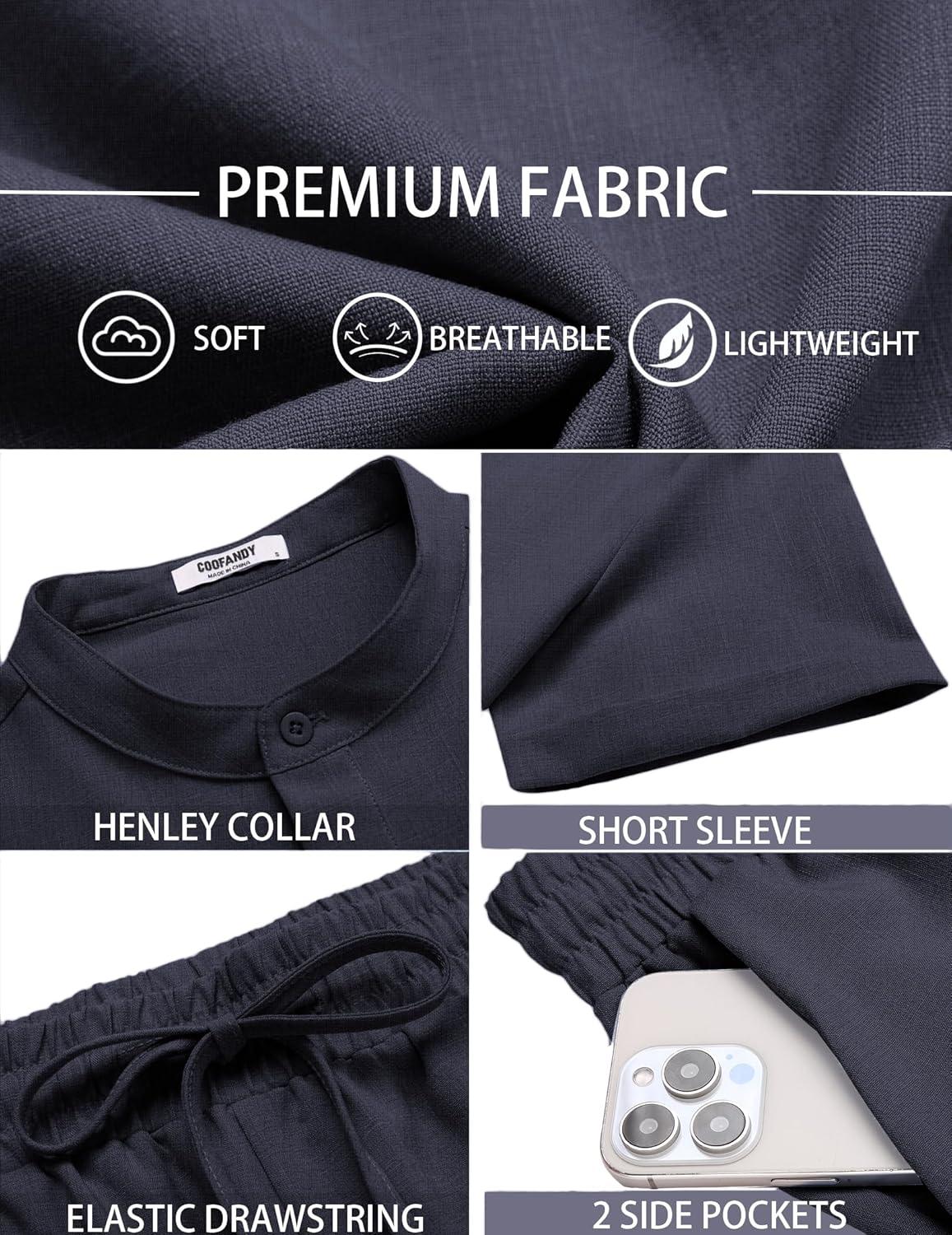 COOFANDY Men’s 2 Pieces Set Short Sleeve Henley Shirts and Shorts Pants Texture Summer Beach Vacation Outfits(Navy Blue)