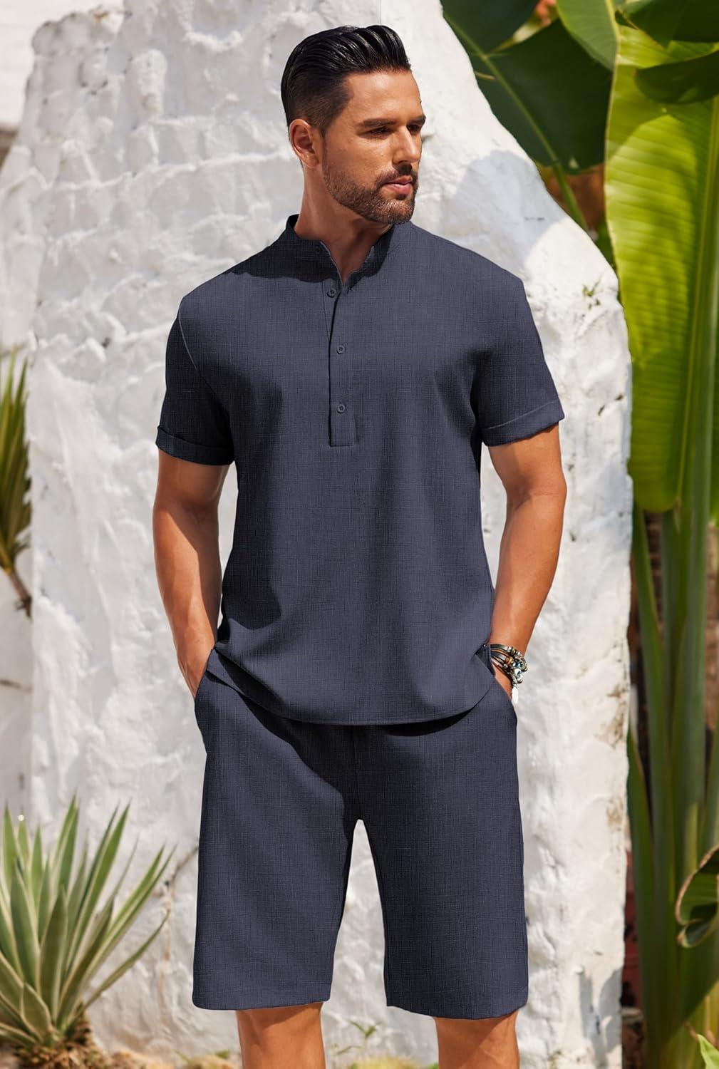 COOFANDY Men’s 2 Pieces Set Short Sleeve Henley Shirts and Shorts Pants Texture Summer Beach Vacation Outfits(Stone)