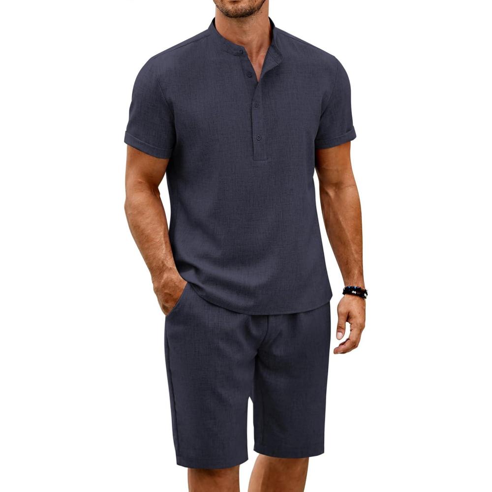 COOFANDY Men's 2 Pieces Set Short Sleeve Henley Shirts and Shorts Pants Texture Summer Beach Vacation Outfits(Navy Blue)