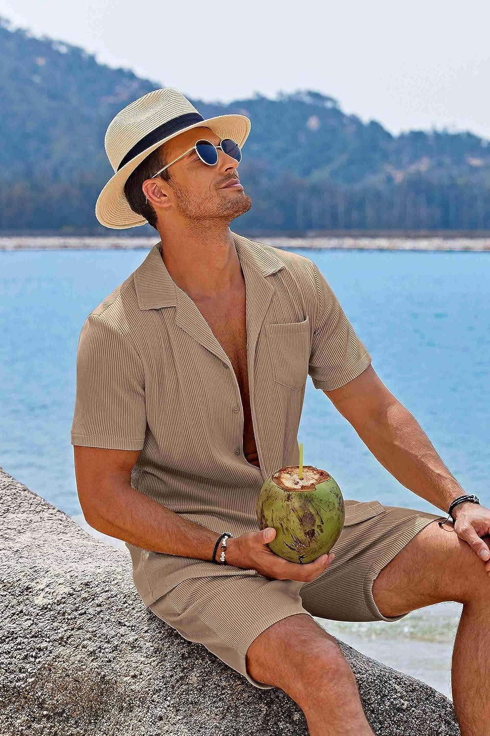 COOFANDY Men's 2 Pieces Shirt Sets Short Sleeve Casual Button Down Hippie T-Shirts Shorts Sets Summer Fashion Beach Outfits(Brown)