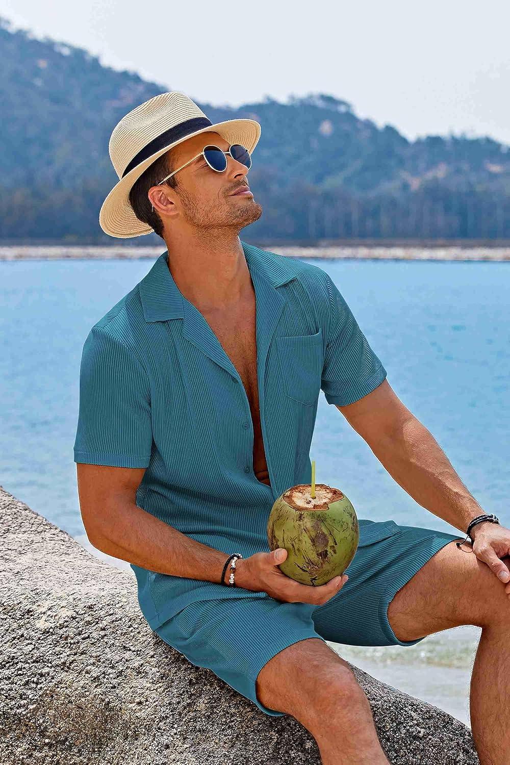 COOFANDY Men’s 2 Pieces Shirt Sets Short Sleeve Casual Button Down Hippie T-Shirts Shorts Sets Summer Fashion Beach Outfits(Lake Blue)